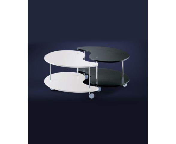 Журнальный столик с двумя уровнями выполнен в современном стиле. Оригинальная фигурная столешница окрашена в матовый или глянцевый черный или белый. Столик на колесиках с хромированной трубчатой рамой.