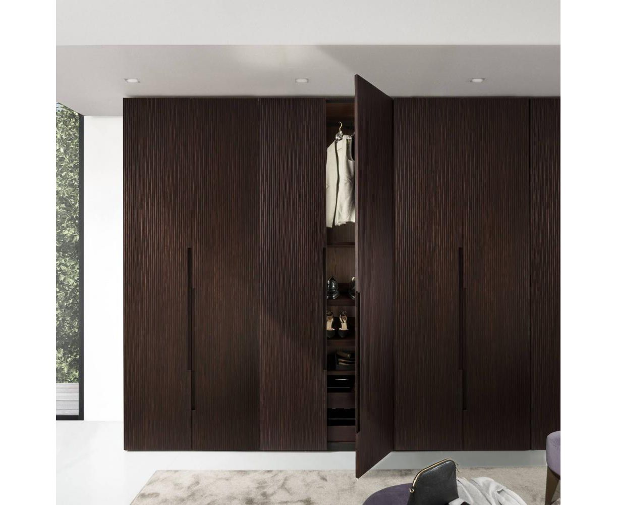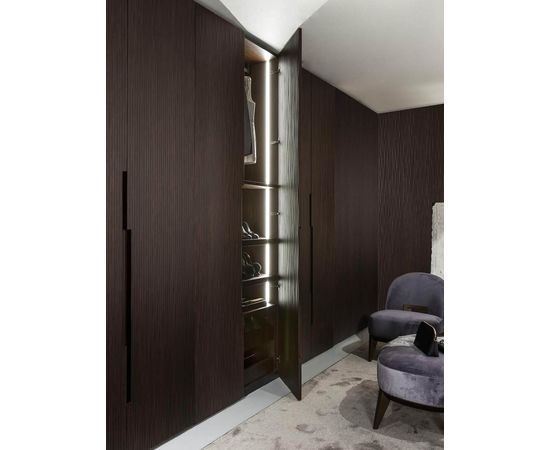 Система шкафов-гардеробов на заказ с распашными дверцами из дерева с резьбой из коллекции Onda. Шкаф может быть персонализирован по размерам, оборудованию, отделке на дверцах и внутренней отделке. Извилистая резьба Onda, разработанная архитектором Риццато и выполненная опытными мастерами, подчеркивает элегантность всего шкафа, способствуя его интеграции в систему дверей и стеновых панелей с такой же отделкой.