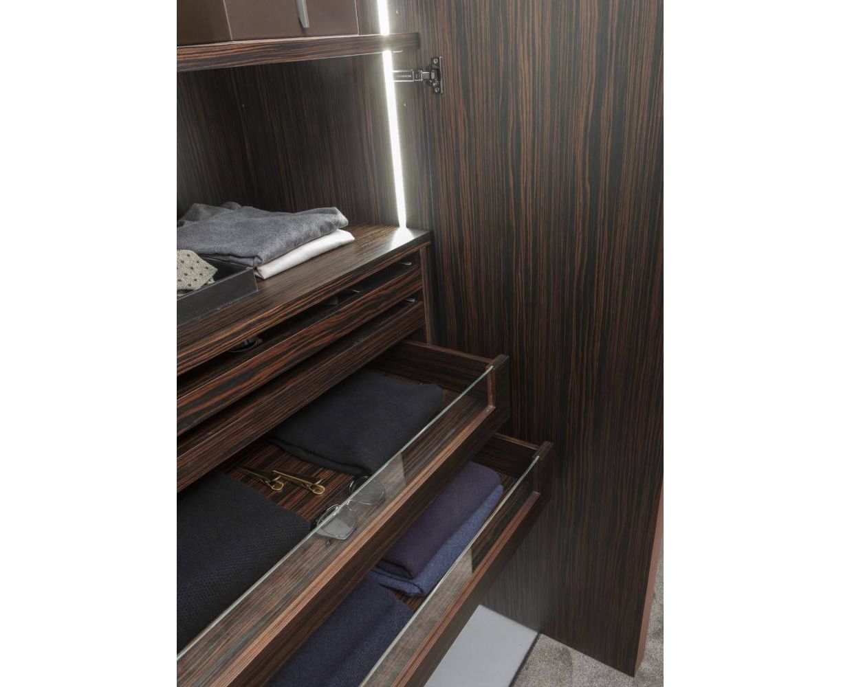 Внутренняя часть шкафов коллекции Stars изготовлена из дерева, отделка из палисандра, венге, ореха каналетто и всех других пород дерева из каталога.