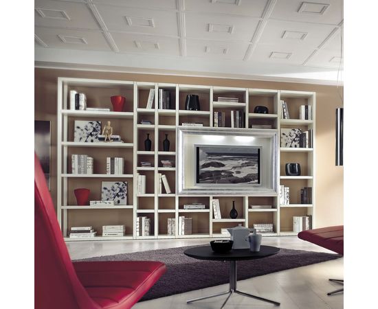 Пример гостиной композиции с открытым торцом и подставкой под телевизор с классической рамой.