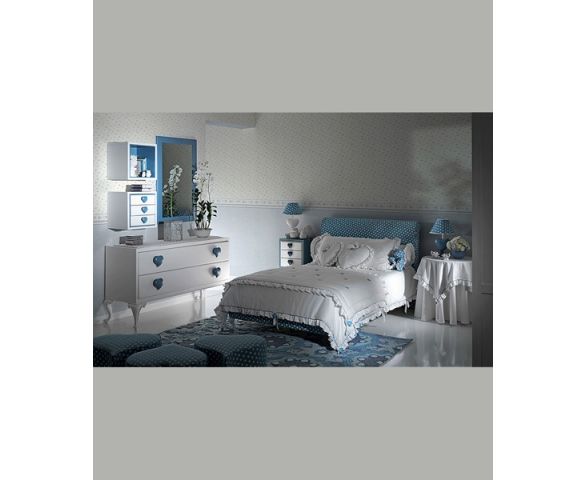 Детский гарнитур Batticuore 2 предназначен как для девочки, так и для мальчика. Он может быть выполнен в различных цветовых вариантах. В комплект входят: кровать с невысоким мягким изголовьем, прикроватная тумба, прикроватный столик, комод, две навесные полки (открытая и закрытая с выдвижными ящиками), несколько пуфиков. Односпальная кровать может быть дополнена различными аксессуарами на выбор: покрывало или декоративные подушечки, скатерть. Гарнитур оформлен узором в виде сердечек. По замыслу дизайнера сердце символизирует тепло и уют. Деревянные части окрашены краской на водной основе.
