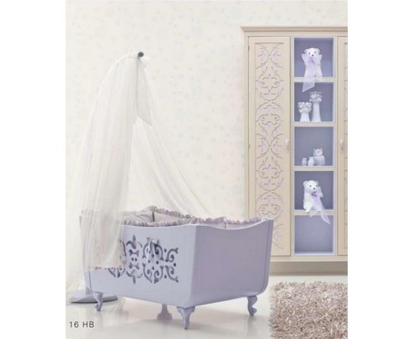 Колыбель Halley NEVIL. Элегантная кроватка для новорожденного. Выполнена в форме люльки. Колыбель оформлена по бокам сквозными резными элементами. В комплекте к модели предлагаются 1 гипоаллергенный матрас на 50х85хh13 см, 4 фигурных ножки высотой 14 см из полиуретановой пены с металлическим стержнем, на выбор несколько вариантов бампера (с бантами и бахромой или с присборенными воланами и бантами). Кроватка изготовлена из ламинированного MDF и тополя. Доступны разные цветовые решения.