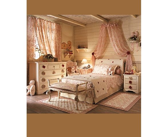 Детский гарнитур Provence 1 предназначен как для девочки, так и для мальчика. Он может быть выполнен в различных цветовых вариантах. В комплект входят: кровать с мягким изголовьем, прикроватный столик и тумбочка, стул с подлокотниками, банкетка, комод с выдвижными ящиками. Односпальная кровать может быть дополнена покрывалом или декоративными подушечками, балдахином. Предлагается также коврики на пол в тон всему ансамблю. Ручки мебели оформлены в виде розочек.