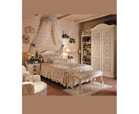 Детский гарнитур Provence 5. Он может быть выполнен в различных цветовых вариантах. В комплект входят: кровать с жестким фигурным изголовьем, прикроватный столик и тумбочка, кресло, платяной шкаф, банкетка, книжный шкаф. Односпальная кровать может быть дополнена покрывалом или декоративными подушечками, балдахином. Шкаф имеет две створки. Ручки оформлены в форме цветка. Предлагается также коврики на пол в тон всему ансамблю.
