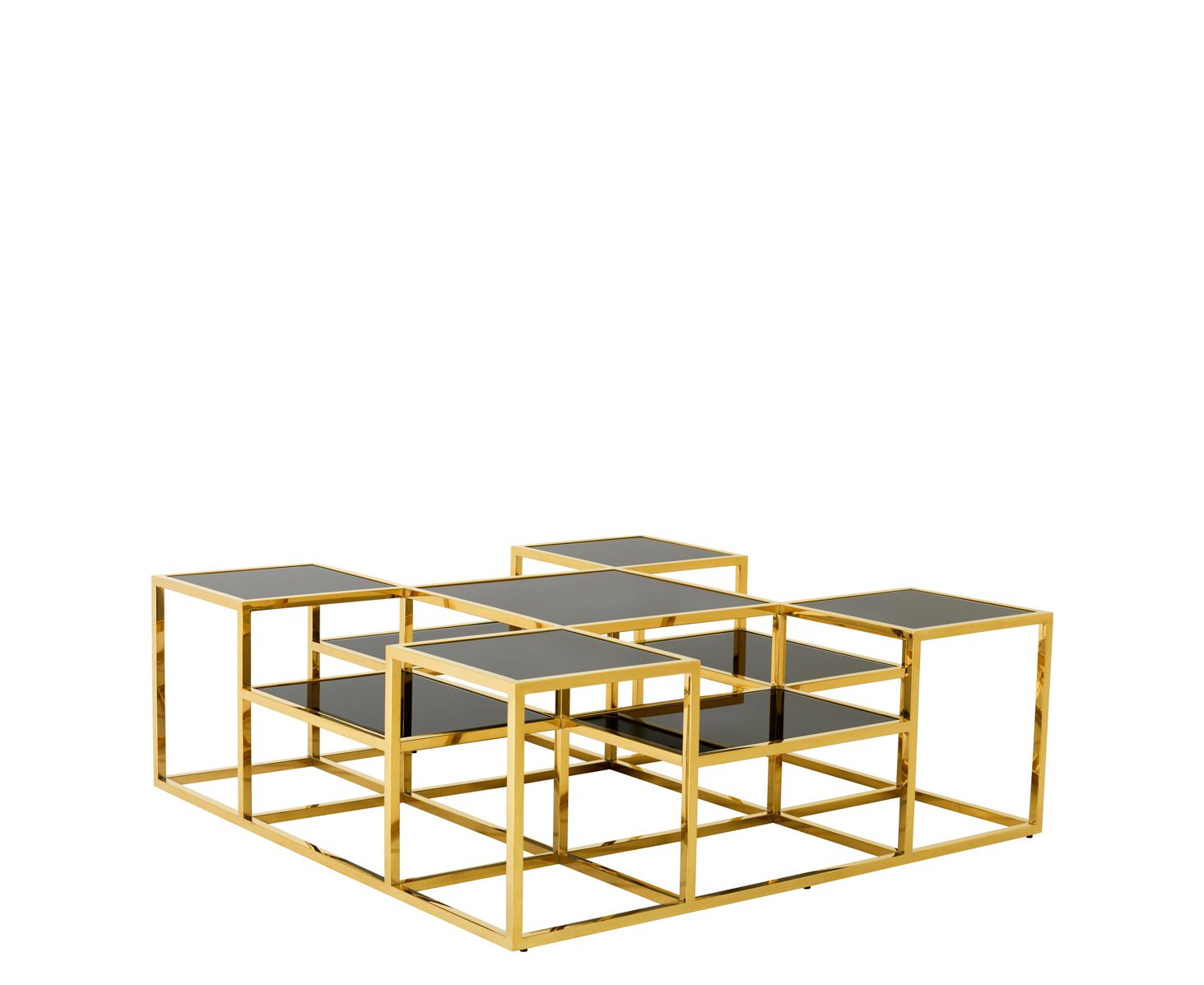 Кофейный столик из стекла и металла. Модель представляет собой целый набор многоуровневых столешниц, которые могут служить, как полки. Столик смотрится очень оригинально.