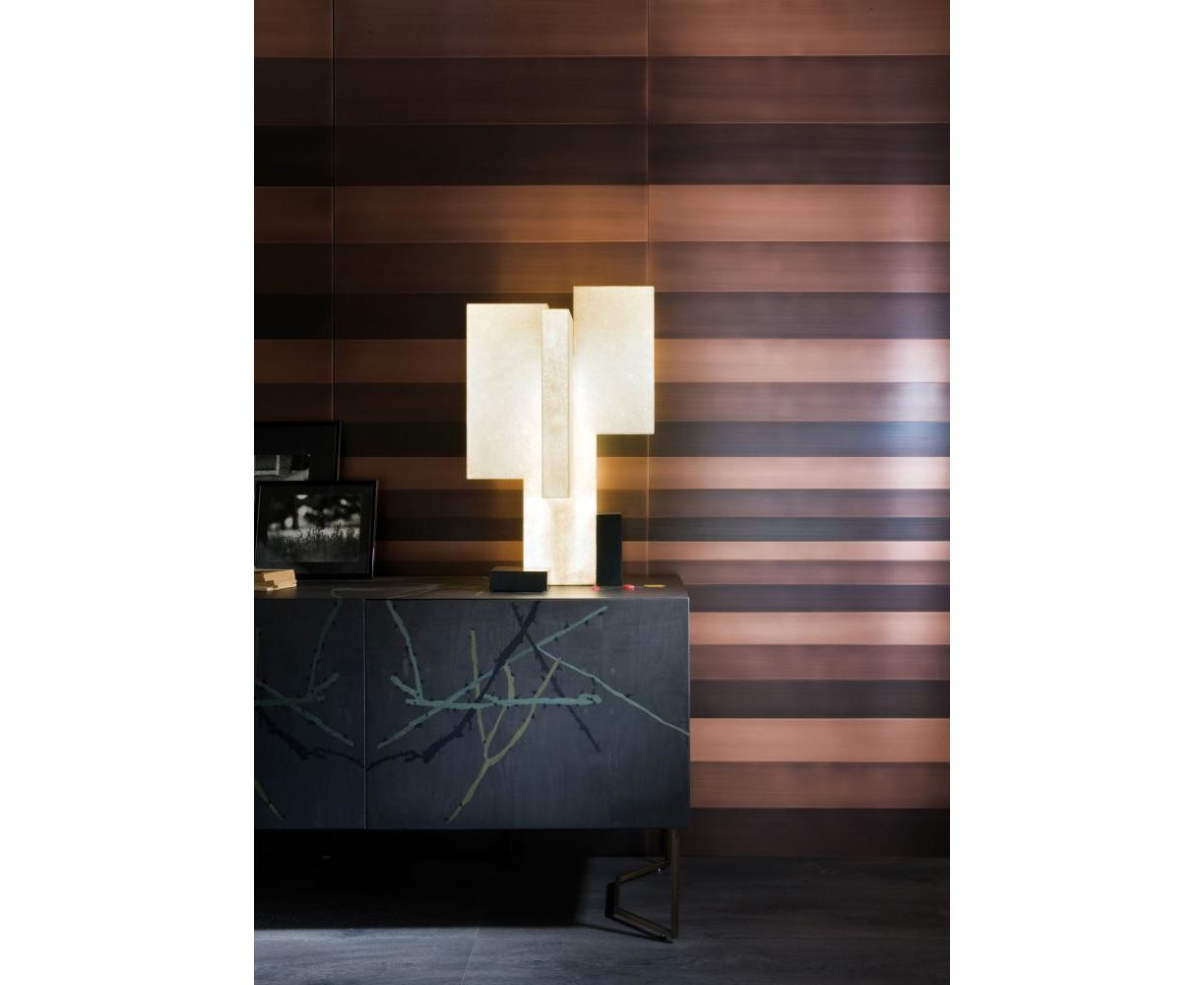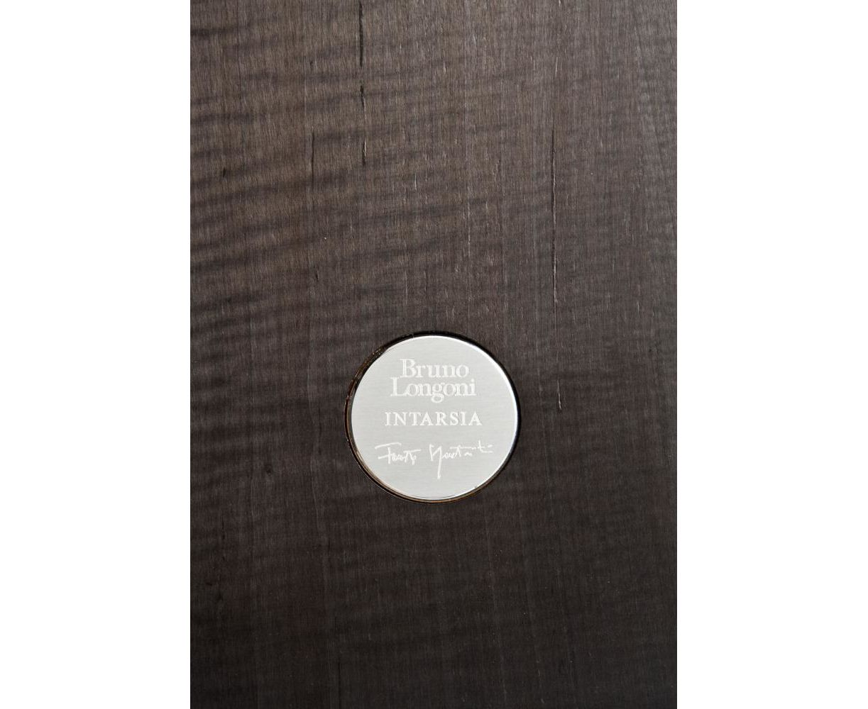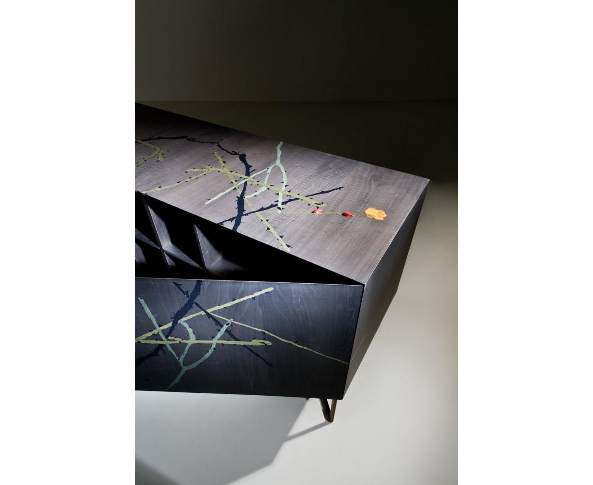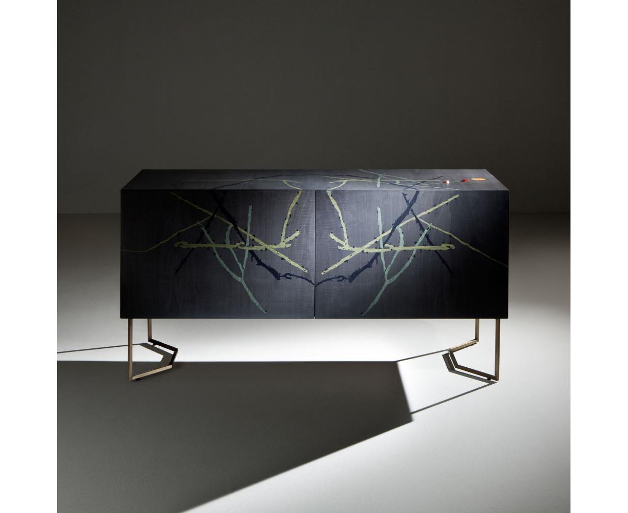 Комод из дерева с инкрустацией, дверцы с открыванием push pull, оснащен полками и двумя ящиками. Ножки из вороненой брашированной латуни.
