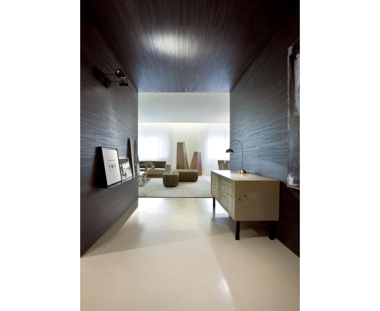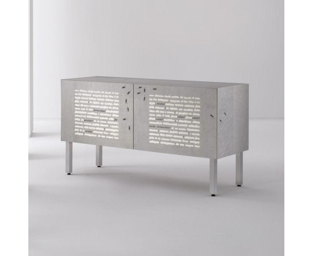 Комод с ножками из брашированного металла, с дверцами с инкрустацией и шпонированным кленом корпусом. Дверцы с открыванием нажатием push-pull и наличие внутренней полки. Доступен также в настенном варианте.