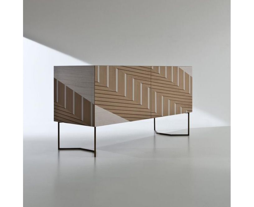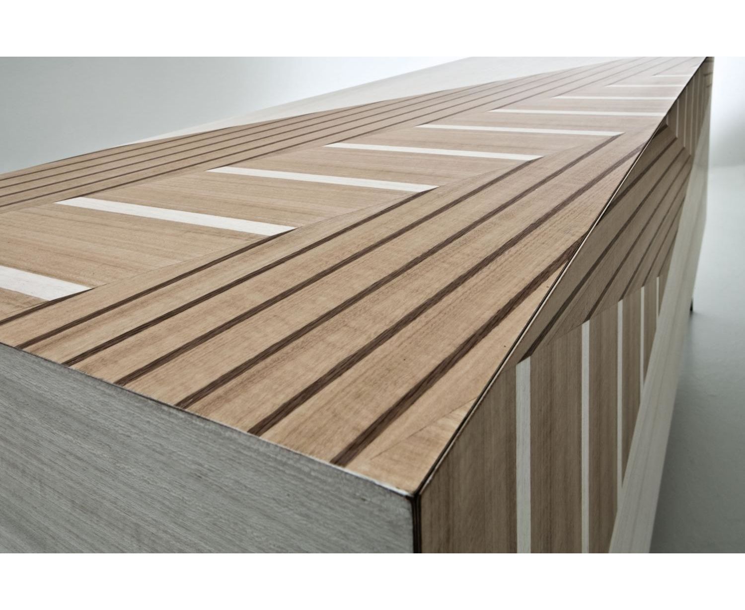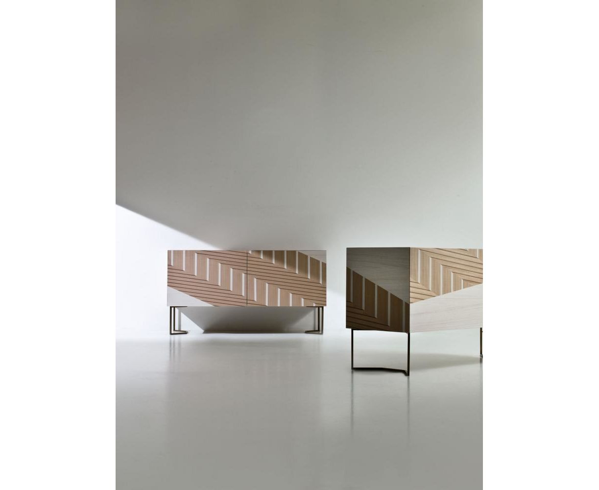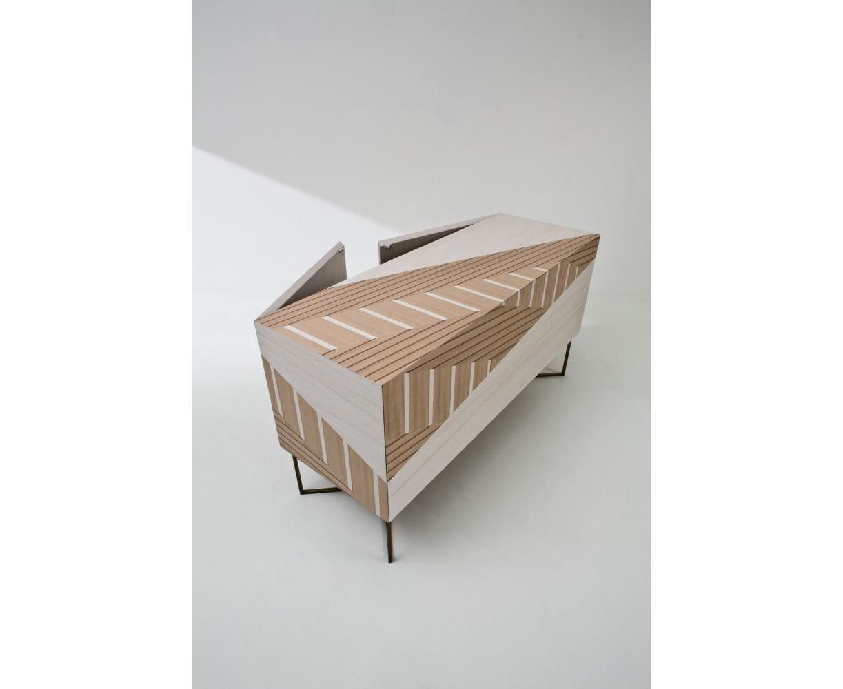 Комод ограниченного выпуска, состоящего всего из 21-го пронумерованного экземпляра. Корпус из дерева с инкрустацией, дверцы с открыванием push-pull, оснащен внутренними полками и 2-мя ящиками, на ножках из вороненой брашированной латуни. Мозаика из натурального дерева Евкалипта, Дуба и Тая, чередуясь с участками белого дерева, окутывает комод, создавая геометрический рисунок света и тени. Высокий уровень качества этого ремесленного предмета мебели заслуживает причисления его к категории пронумерованных изделий ограниченного выпуска.