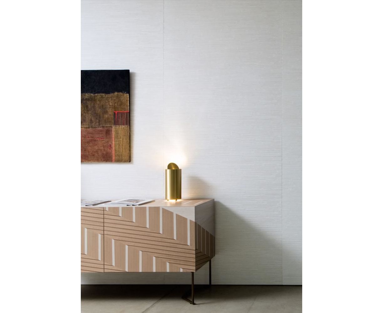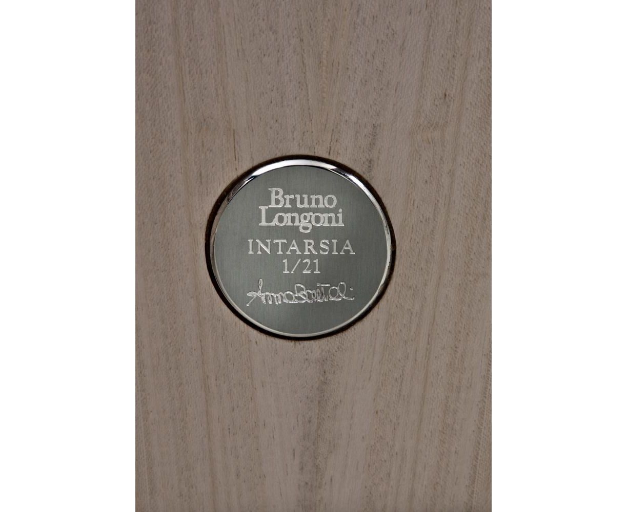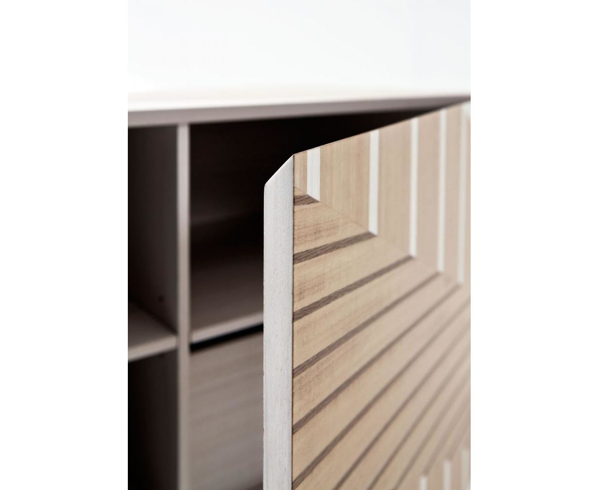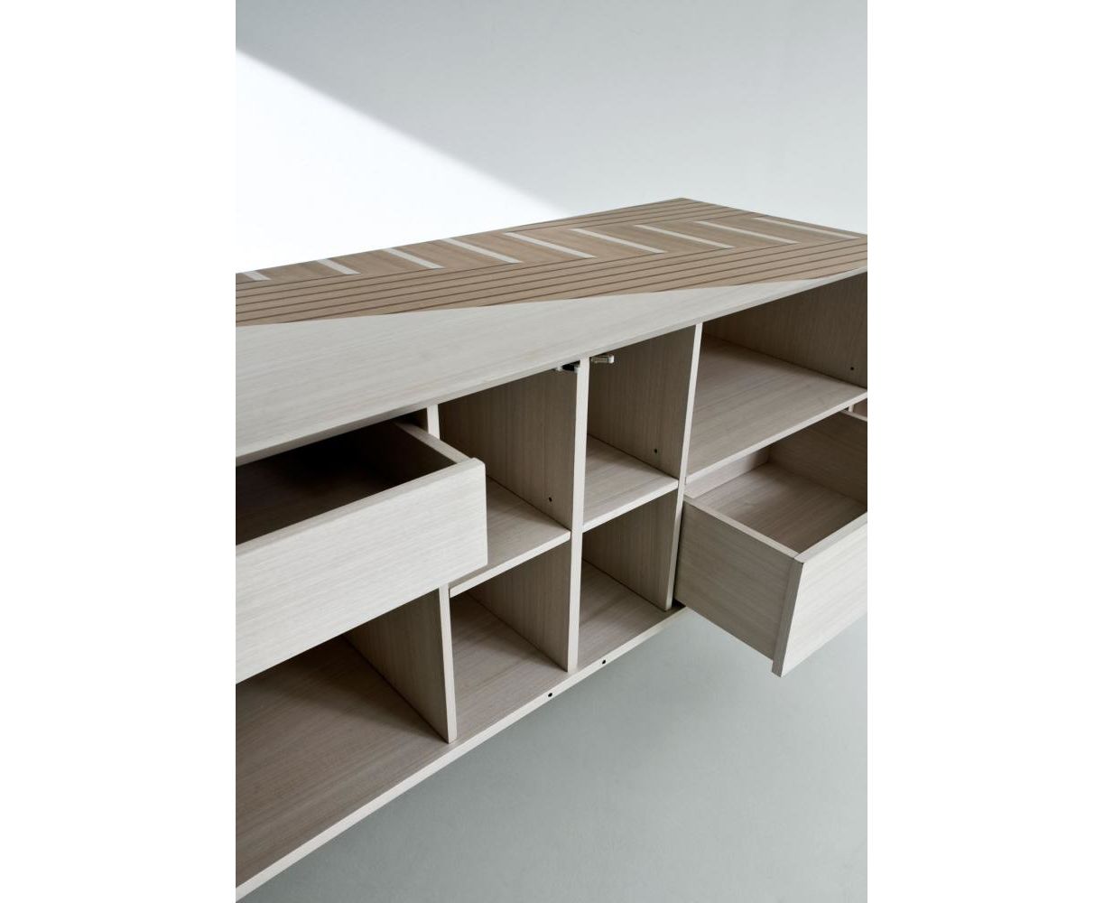 Комод ограниченного выпуска, состоящего всего из 21-го пронумерованного экземпляра. Корпус из дерева с инкрустацией, дверцы с открыванием push-pull, оснащен внутренними полками и 2-мя ящиками, на ножках из вороненой брашированной латуни. Мозаика из натурального дерева Евкалипта, Дуба и Тая, чередуясь с участками белого дерева, окутывает комод, создавая геометрический рисунок света и тени. Высокий уровень качества этого ремесленного предмета мебели заслуживает причисления его к категории пронумерованных изделий ограниченного выпуска.