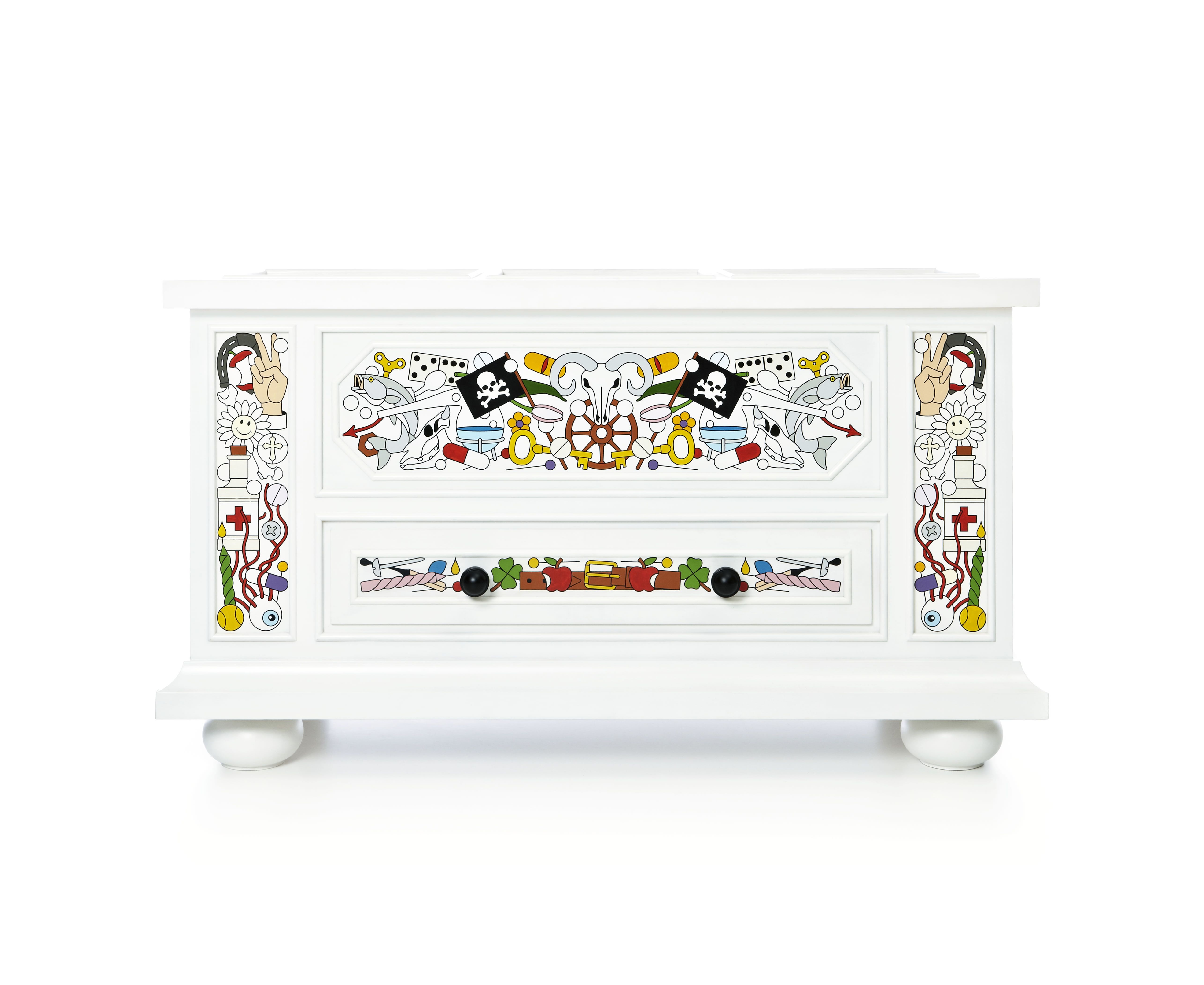 Оригинальное дизайнерское решение воплотилось в коллекцию Altdeutsche, чтобы восхищать, удивлять и привлекать. Вместительный комод-сундук, который можно использовать и как столик. Модель стоит на пухлых плюшках-ножках. При оформлении и отделке использованы простейшие символы из разных направлений.