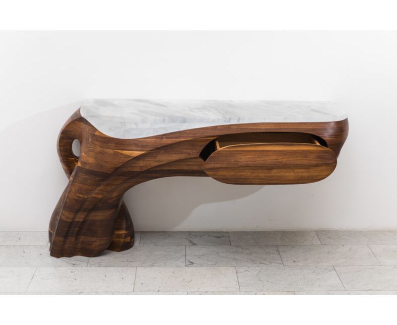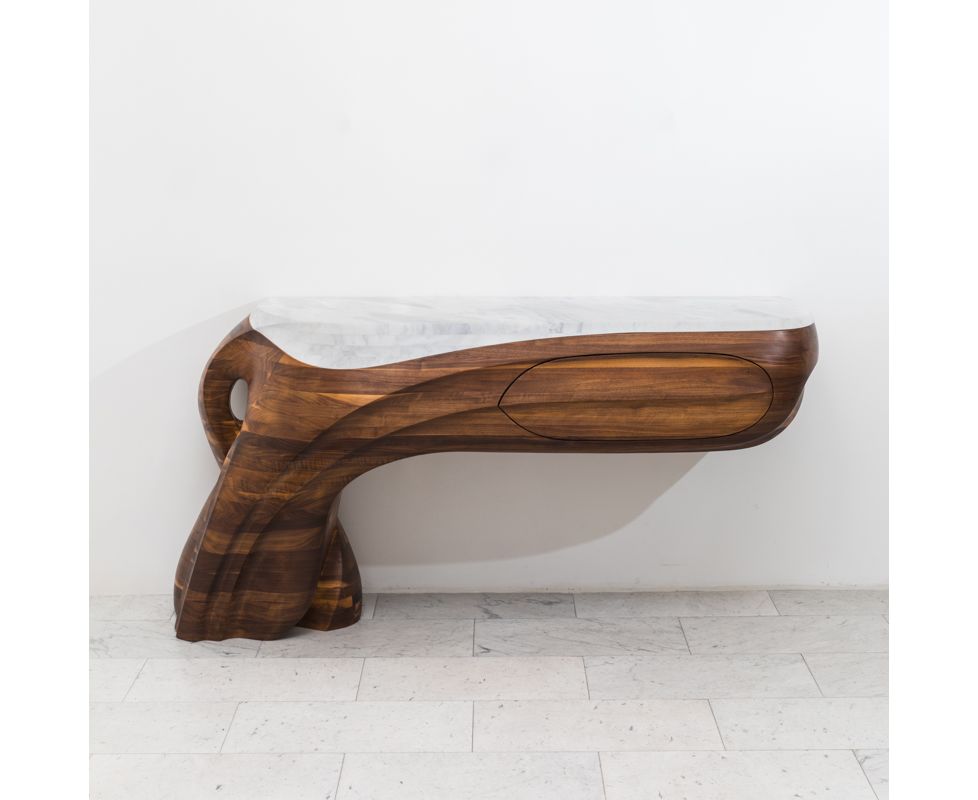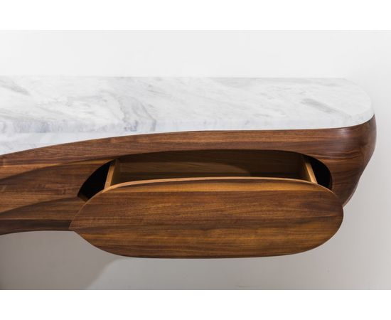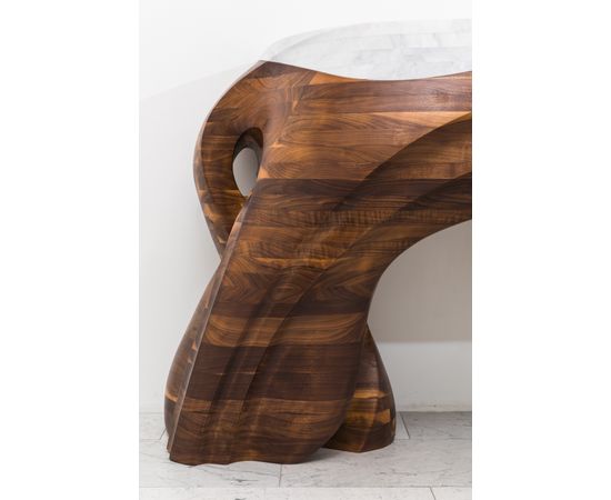 BANG - одновременно высшее произведение искусства и функциональный объект, уникальная консоль ручной работы, не поддающаяся простой классификации. Десятилетний опыт работы Маркуса Хаазе как скульптора очевиден в его мастерской обработке материалов; древесина кажется такой же податливой, как драпировка, поскольку она изгибается плавными волнами выпуклых и вогнутых форм под мраморной столешницей, вырезанной вручную.