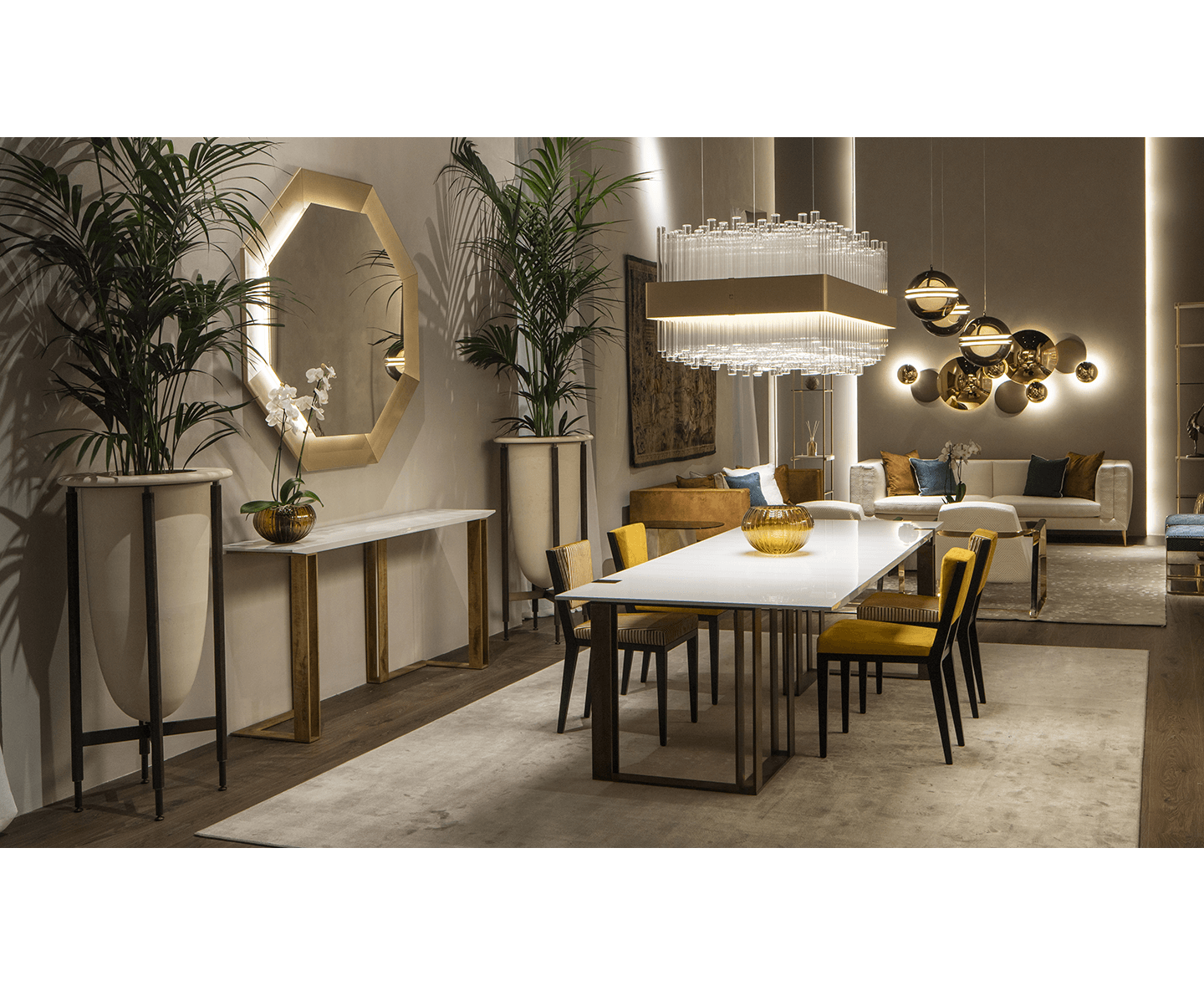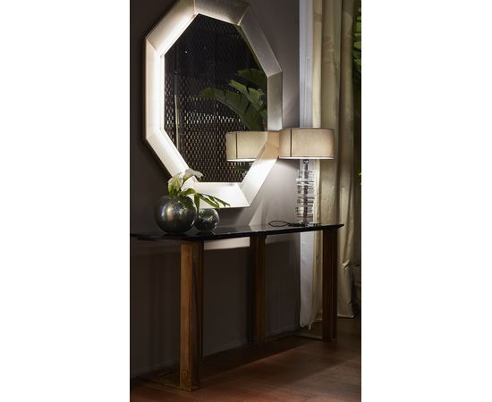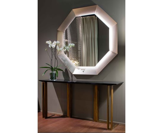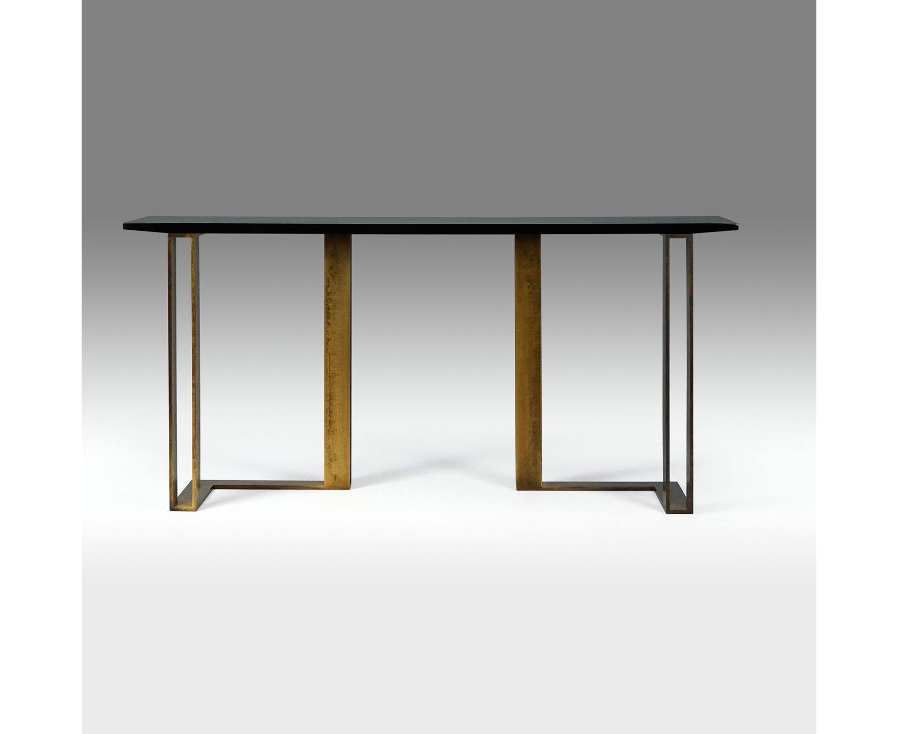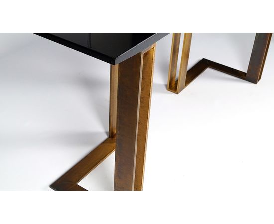 Black & Gold Console украшена необычным и очень элегантным сочетанием материалов: один натуральный, маркированный, архитектурный, из металла, а другой более законченный, блестящий, декоративный и роскошный, лакированный черный или слоновая кость толщиной 3,2 см. Консоль имеет топ из мдф с лакированной отделкой 100% глянец черного или цвета слоновой кости Ral 1035; нижний край коротких концов слегка расклешен, а двойное основание изготовлено из твердого металла с матовой латунной отделкой.