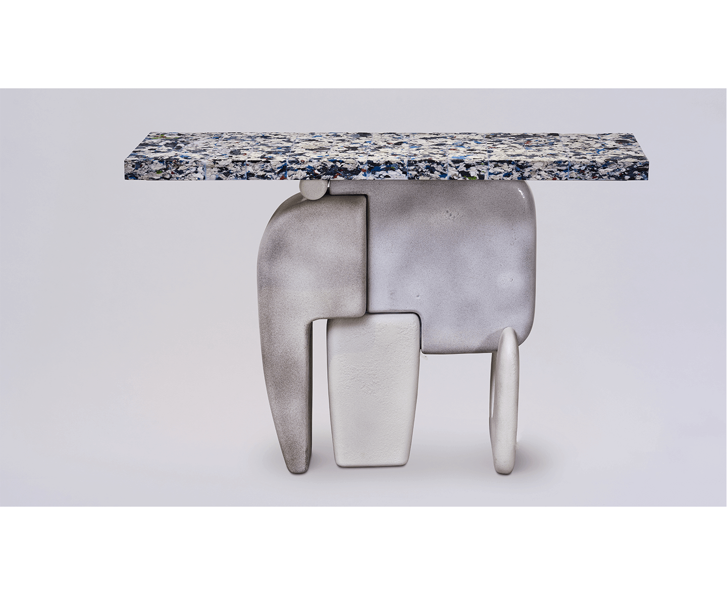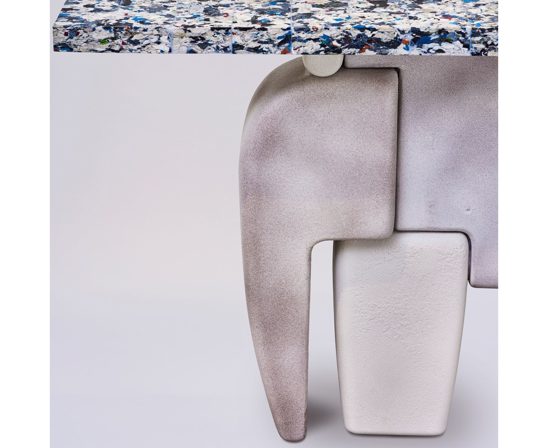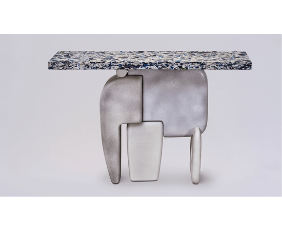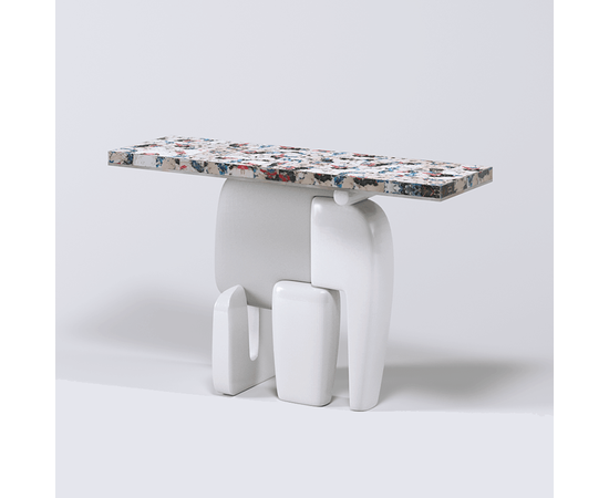 Монолитная консоль со скульптурными, культовыми формами. Элементы из белой керамической основы Faenza ручной работы чередуются между глазурованной и матовой отделкой. Верх толщиной 5 см сделан из штампованных блоков из переработанной ткани с внешней прозрачной экологичной отделкой из смолы.