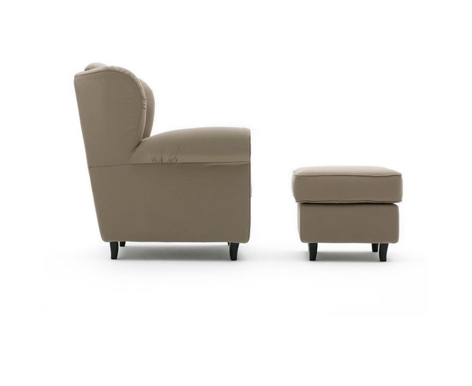 Доступен с тканевым покрытием. Кресло и пуф. Ножки из красного дерева, высота 12 см.