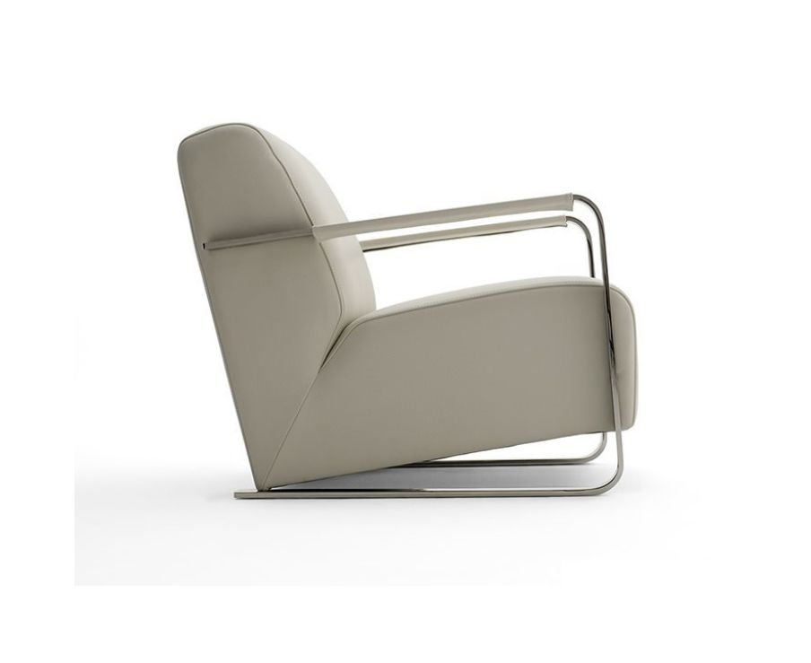 Доступен с кожаной обивкой. Кресло с металлическими подлокотниками. Хромированный металлический кронштейн или хромированная поворотная основа.