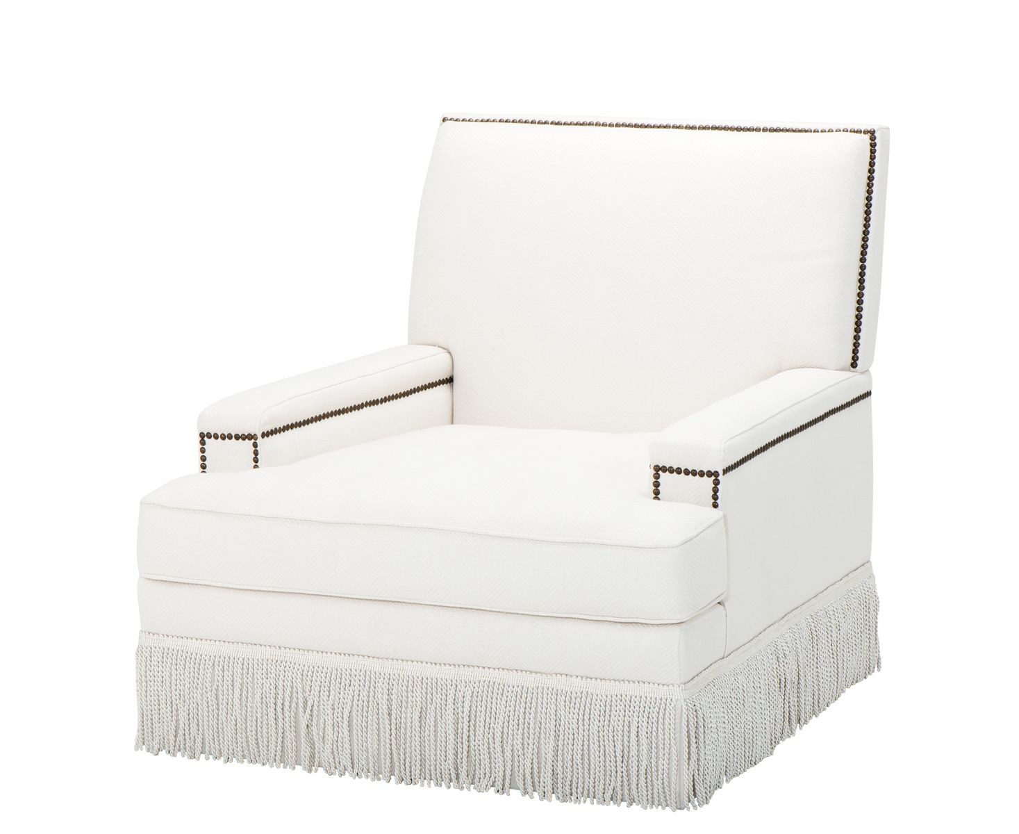 Мягкое классическое кресло для гостиной. Прямая спинка, мягкие низенькие подлокотники. Подушка сиденья съемная. Модель декорирована мебельными гвоздиками и бахромой внизу.