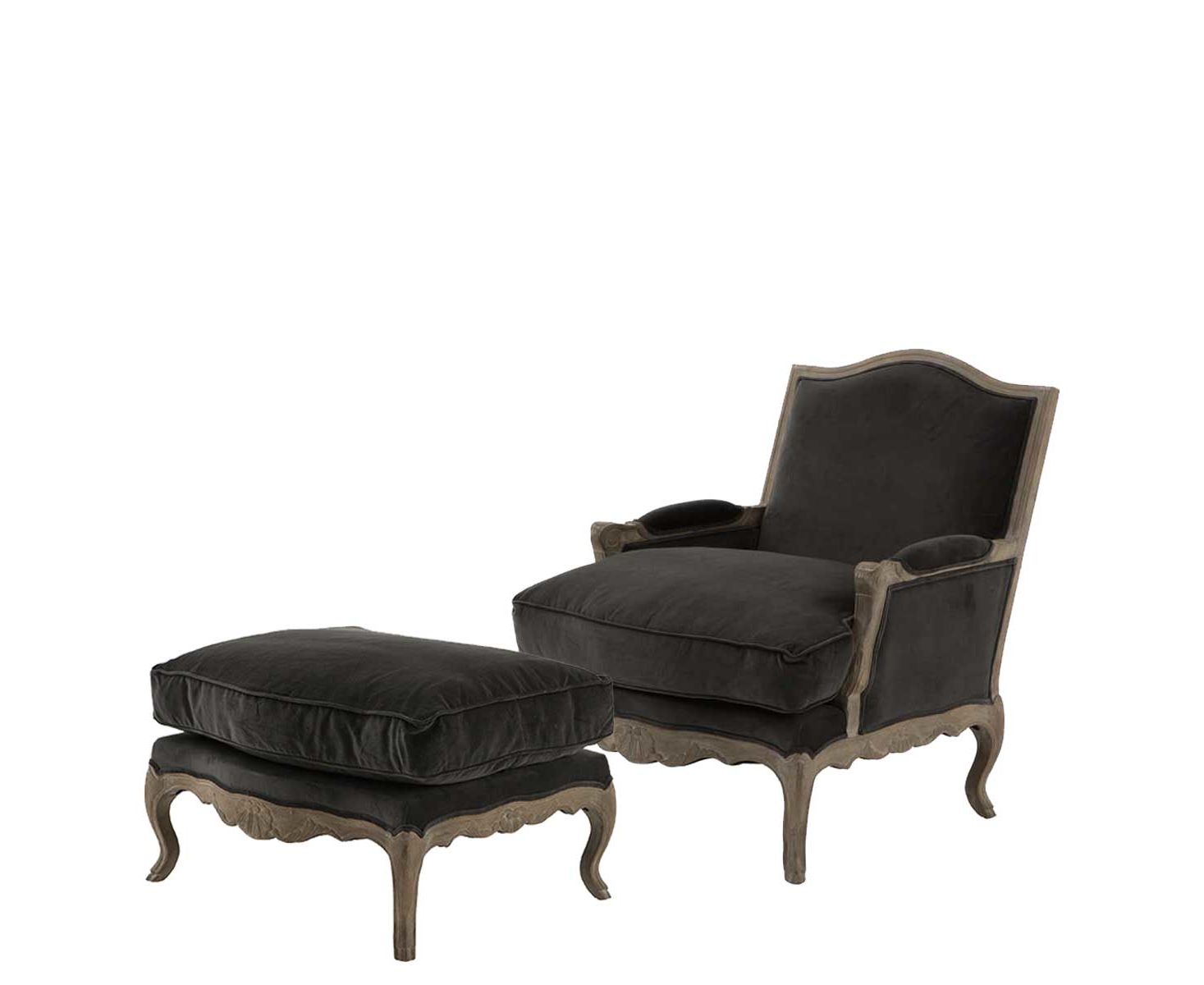 Кресло в классическом стиле. Прекрасно впишется в интерьер гостиной, кабинета или библиотеки. Высокая спинка. Изящные подлокотники с мягкими вставками. Подушка сиденья не закреплена на каркасе и слегка выступает за него. Деревянный каркас украшен резными элементами. Модель стоит на ножках кабриоли. Кресло дополнено пуфом - подставкой для ног в таком же стиле.