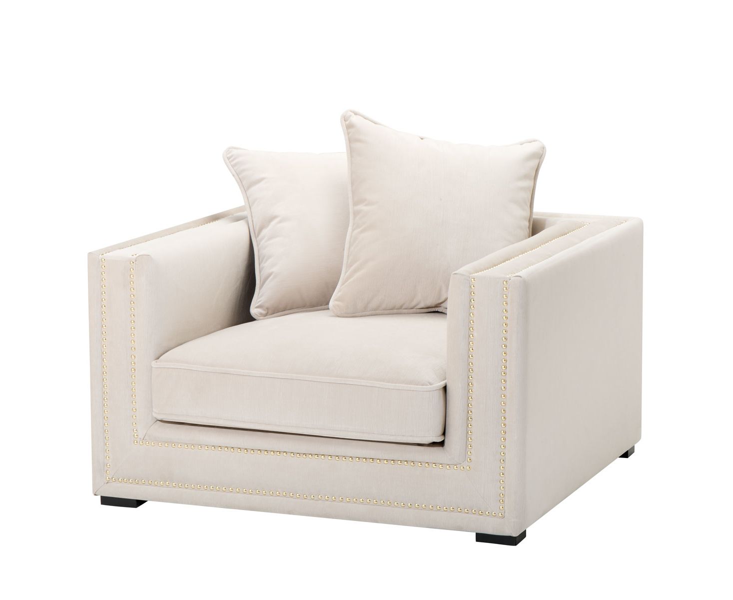 Мягкое уютное кресло в современном классическом стиле. Невысокая широкая спинка переходит в подлокотники и смягчается двумя подушками, которые можно свободно перемещать. Подушка сиденья не закреплена на каркасе. Кресло украшено мебельными гвоздиками контрастного цвета.