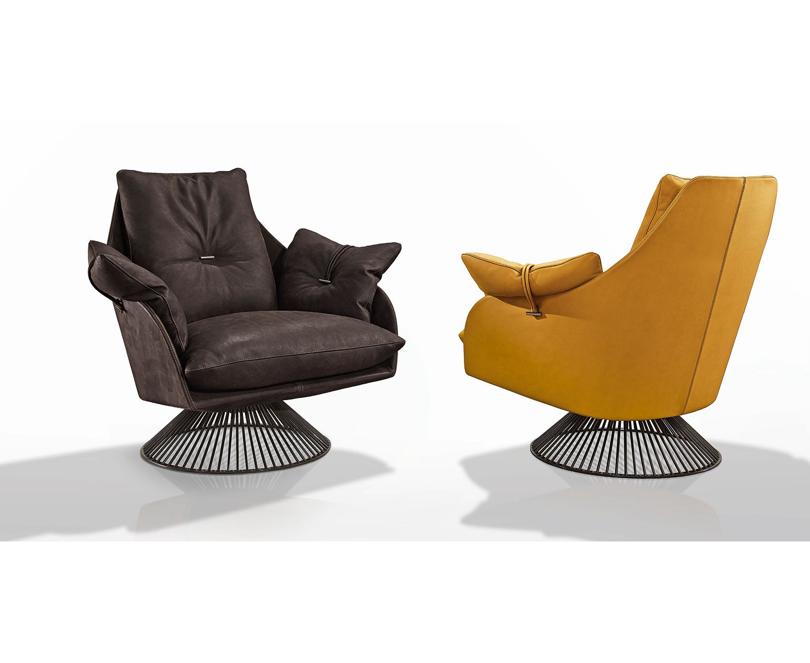Крутящееся кресло, боковые элементы которого могут быть обшиты кожей или окрашены, оснащено мягкими подушками для сиденья с роскошными деталями. Среди деталей с возможностью персонализации — шнур для подлокотников и центральный галун.