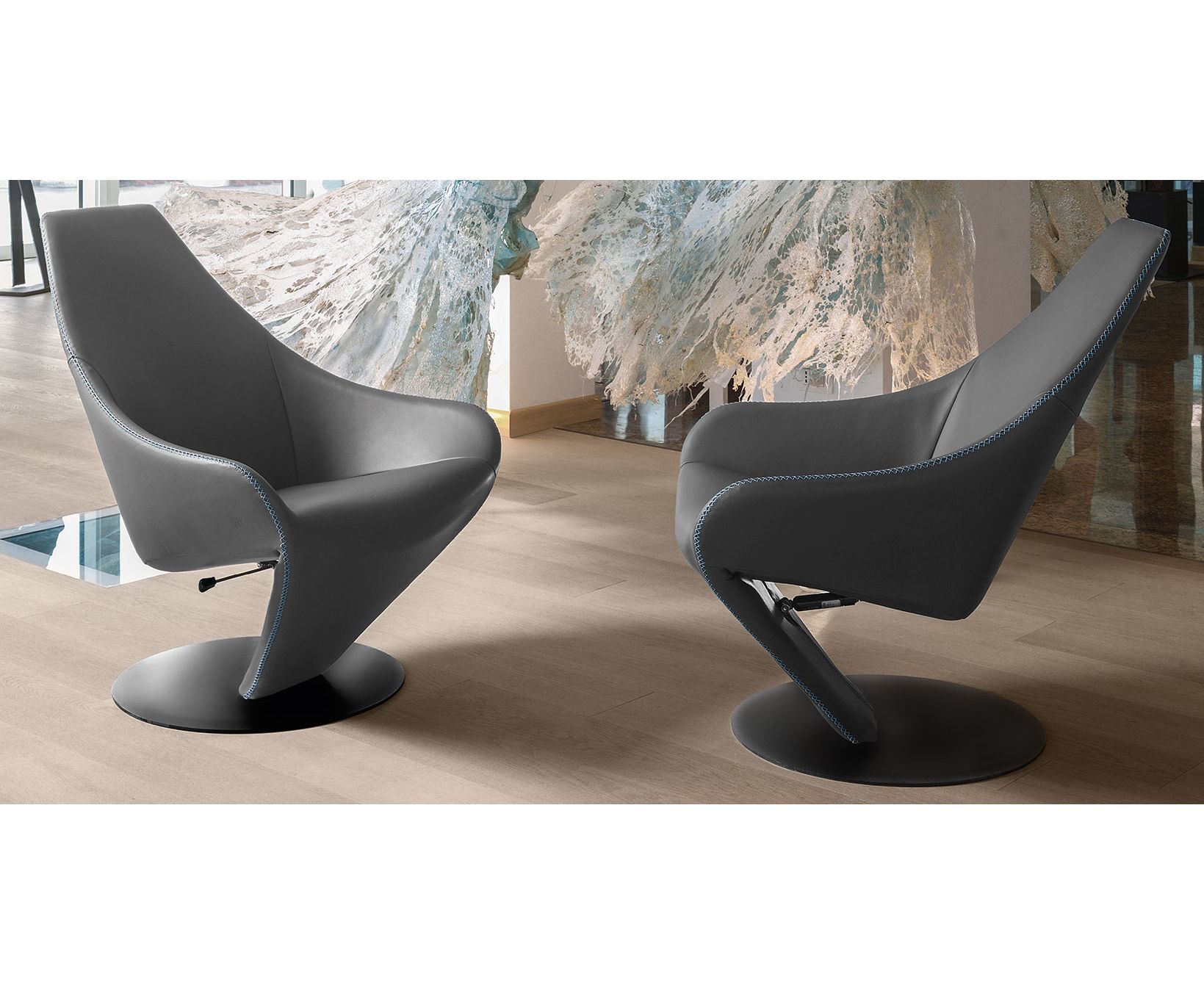 Дизайнерское кожаное кресло, отличающееся эргономичностью, со специальным швом, проходящим по всему периметру изделия от основания до верха. Это кресло поставляется с крутящейся основой или откидной спинкой для максимальной релаксации и комфорта.