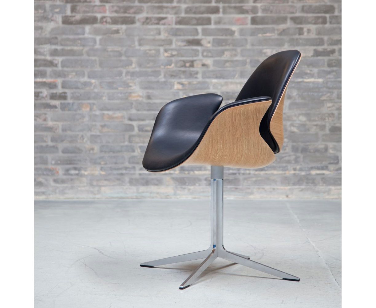 Дуэт дизайнеров Salto & Sigsgaard уловил дух и элегантно перенес наследие Финна Юля в 21-й век, создав очень скульптурное по своей форме кресло. Спинка и сиденье выполнены из древесной фанеры, выгнутой в трех измерениях. Внутренняя часть в обивке из натуральной коровьей кожи или шерсти. Сиденье будто обнимает сидящего, как перчатка. Вращающееся основание, выполненное из литого алюминия.