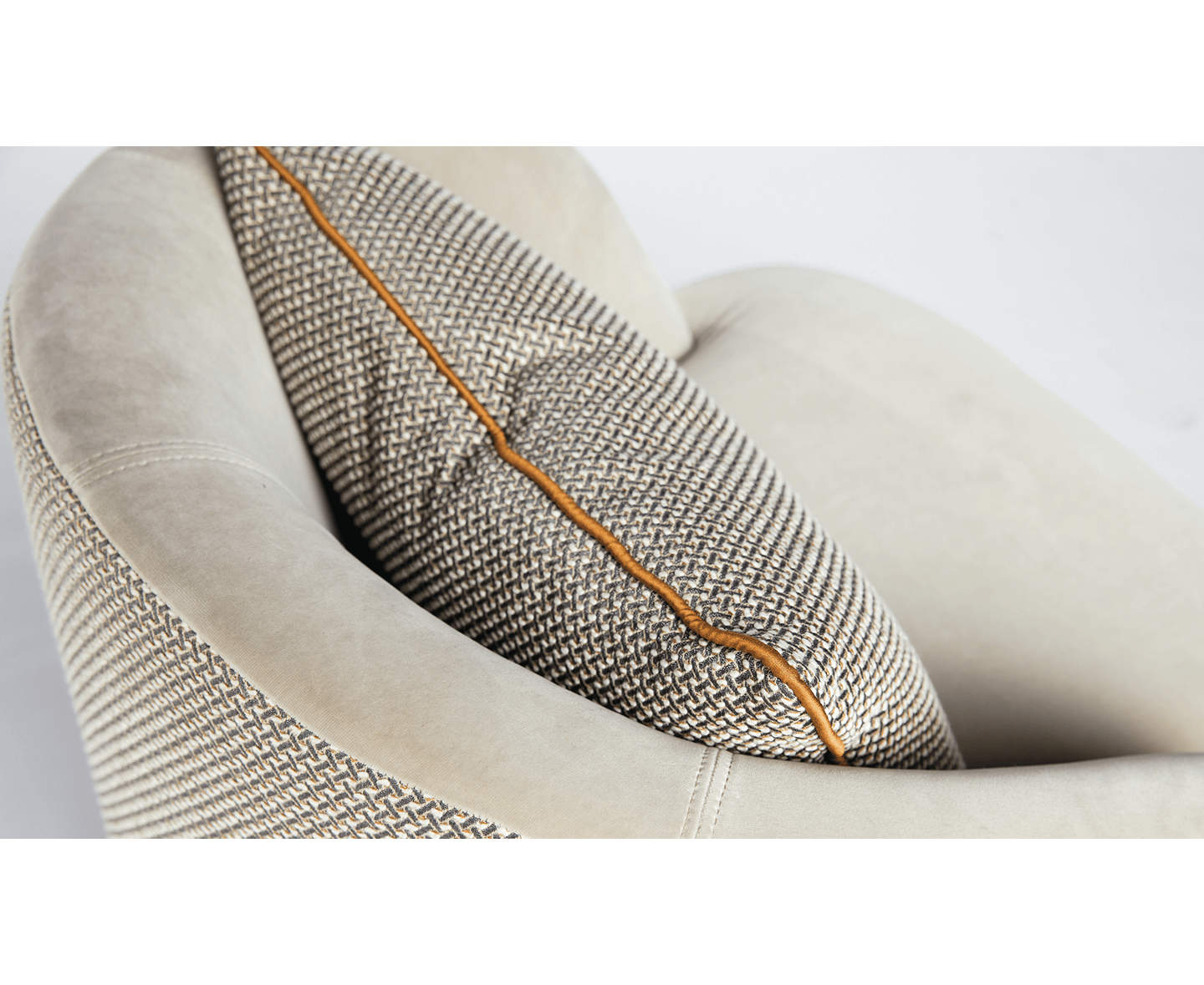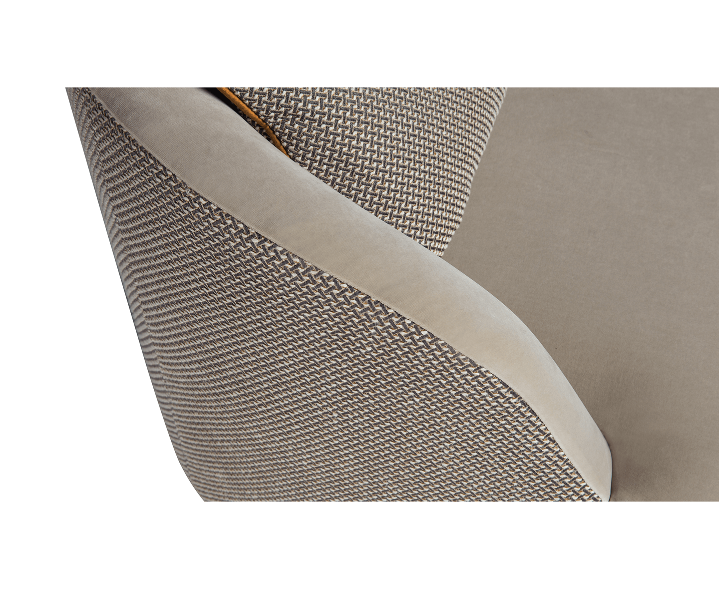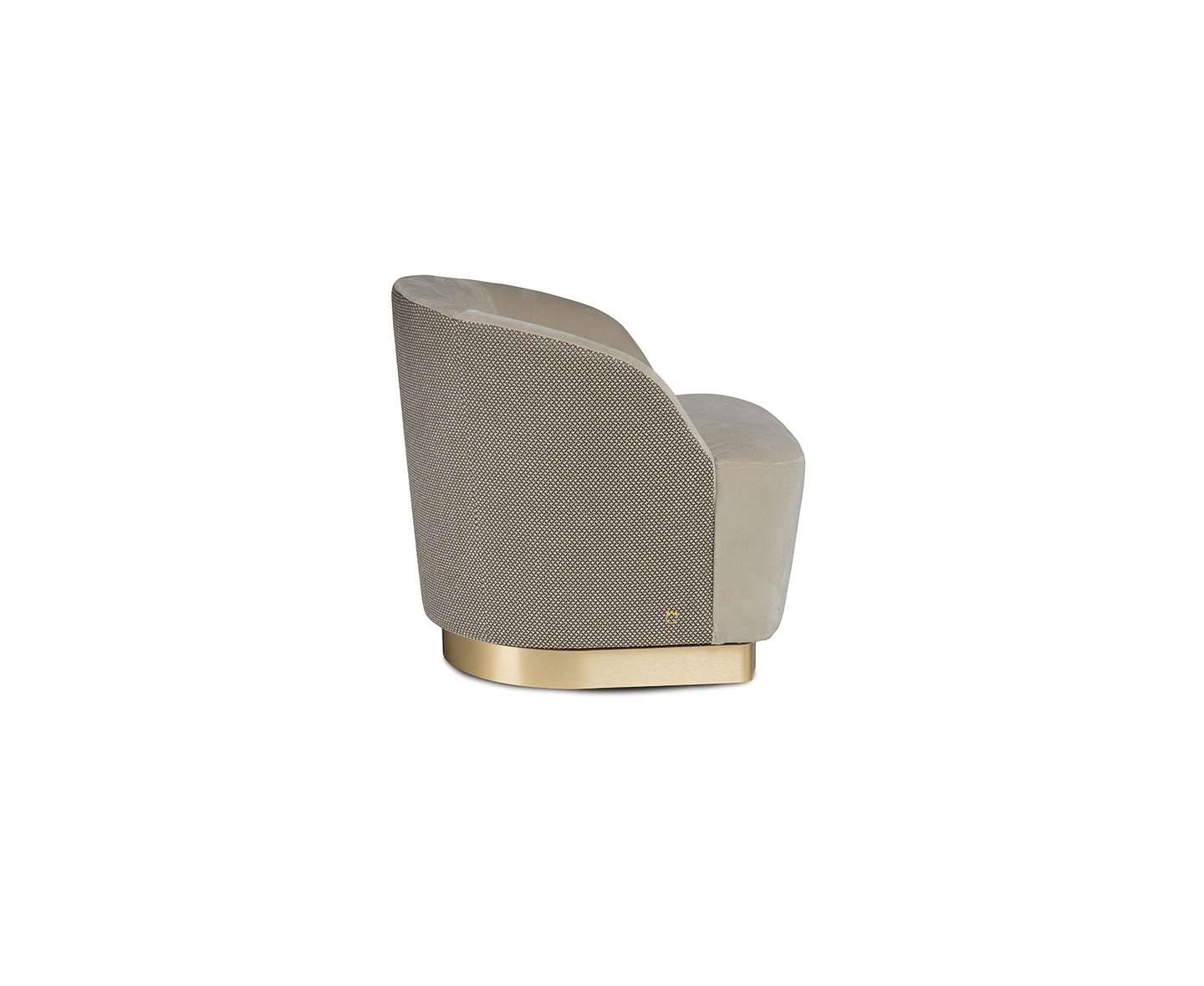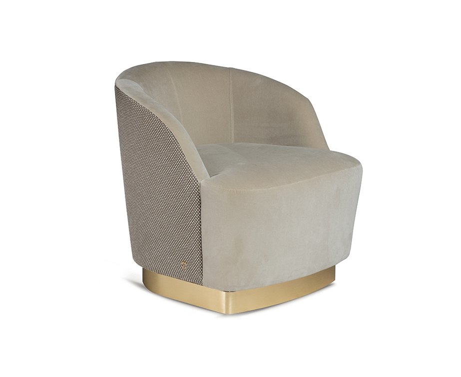 Кресло с обволакивающими линиями и высокой спинкой. Это дополнение к коллекции Venice подходит как для гостиной, так и для спальни и имеет внутреннюю структуру из фанеры с полиуретановой подкладкой переменной плотности и настраиваемое несъемное покрытие из тонких тканей, изысканной коровьей и кожи и нубук. Сиденье установлено на поворотной основе из матового сатинированного ламината из золота и металла.