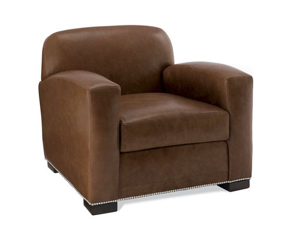 Этот классический клубный стул 1940-х годов имеет сшитые в седло бейсбольные швы, оловянные гвозди, отделку из орехового дерева и блок-ножки.