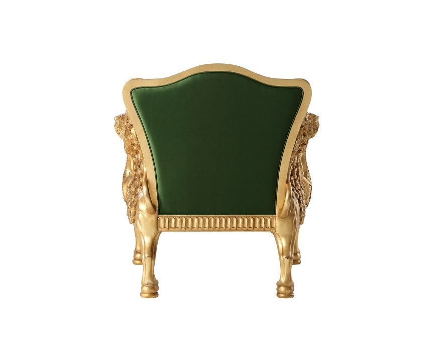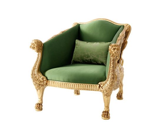 Исключительно ручной работы кресло из красного дерева и позолоты, арочный верхний поручень над жесткой спинкой и опущенными вниз руками, сиденье одной декоративной подушкой, с резными элементами из листьев над завитками ножек.