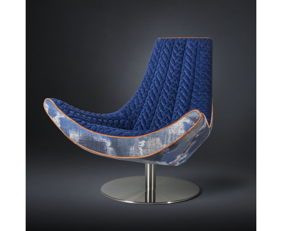 Легкое вращающееся кресло ручной работы, характеризующееся уникальным дизайном и удобным обитым сиденьем и спинкой.