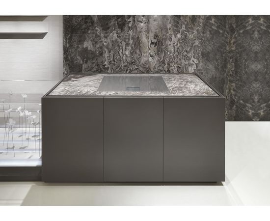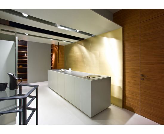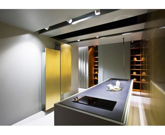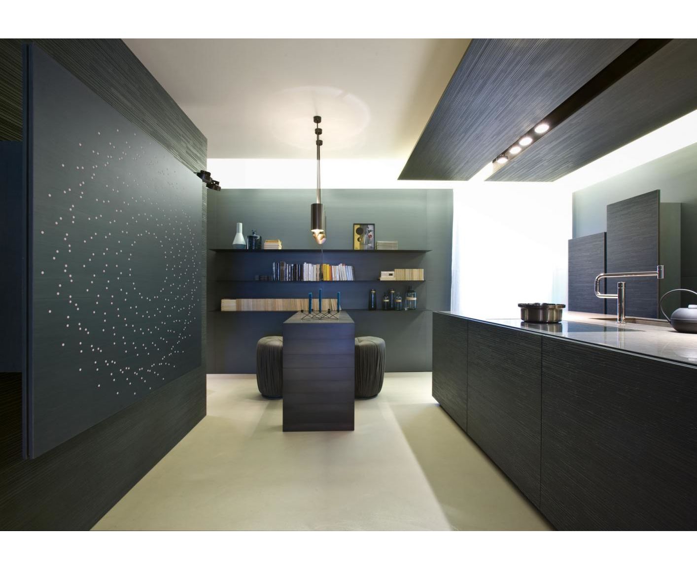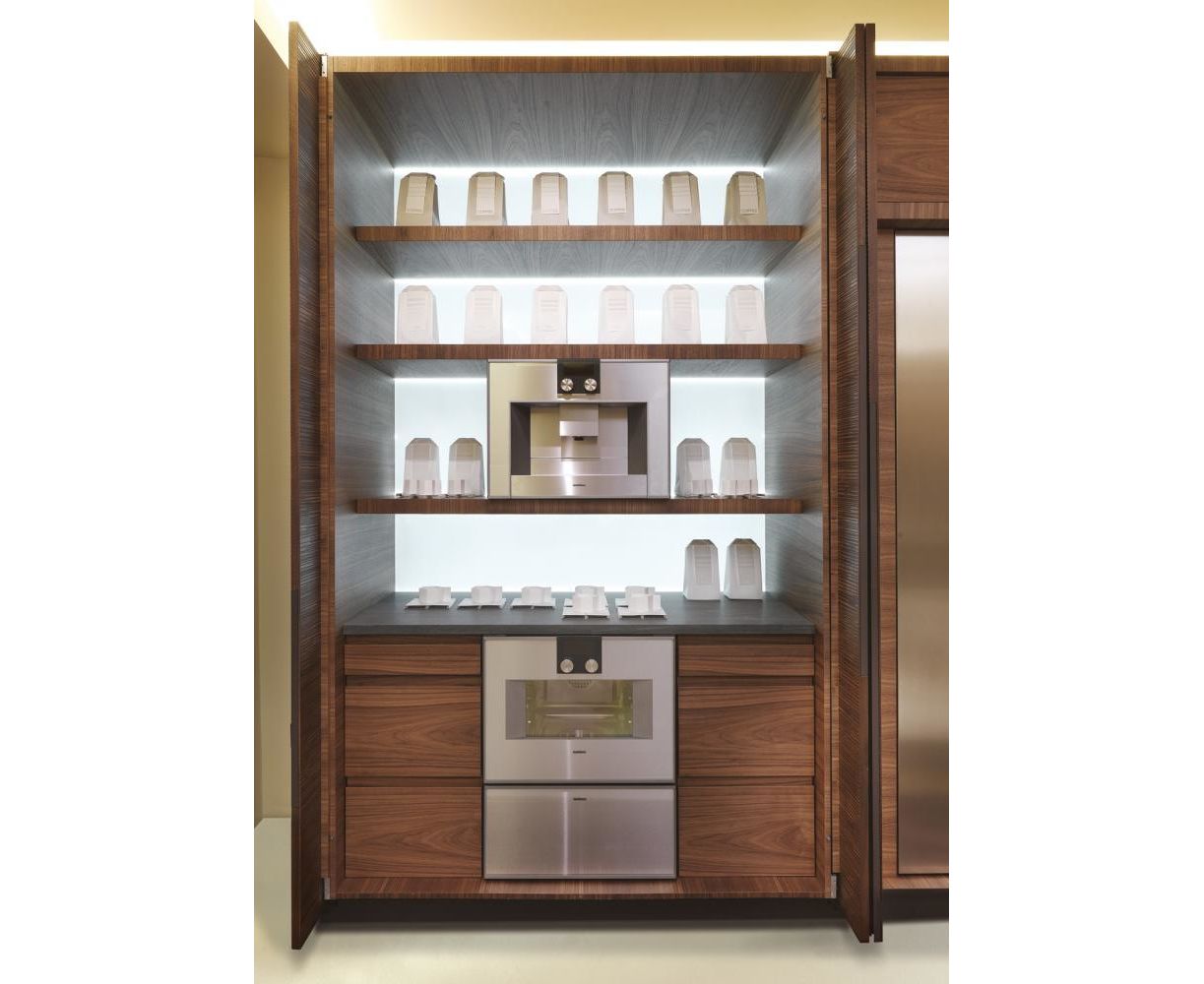 Bellagio Kitchen – это проект, осуществляемый на заказ, который позволяет находить и выполнять лучшие решения с точки зрения эстетики и функциональности. Раздвижные скрытые двери с насечками с обеих сторон прячут небольшую кухню, оснащенную раковиной, отделением-погребком для хранения вина и полкой с держателем для рюмок, в то время как спинка изготовлена из плексигласа со встроенной системой подсветки.