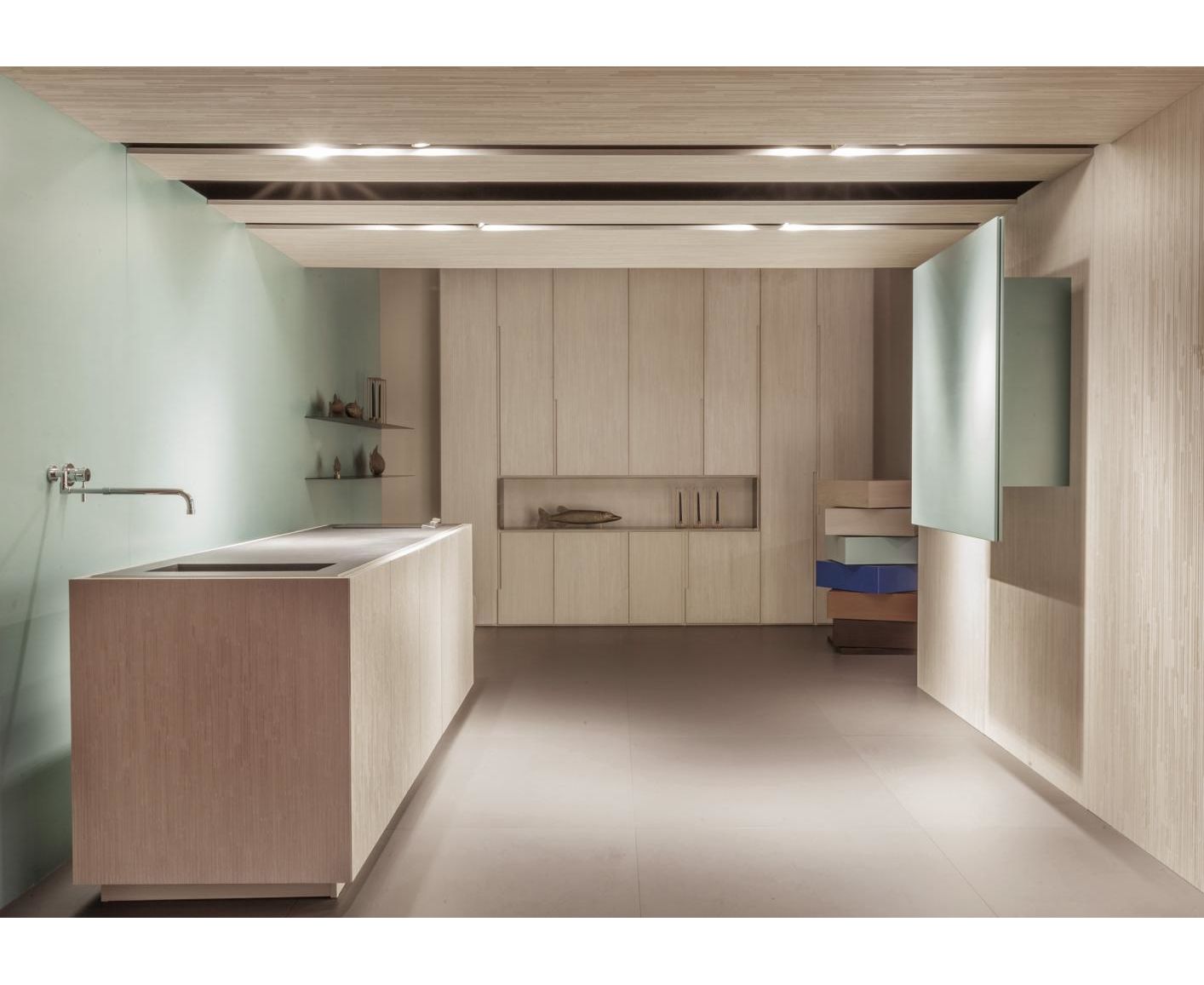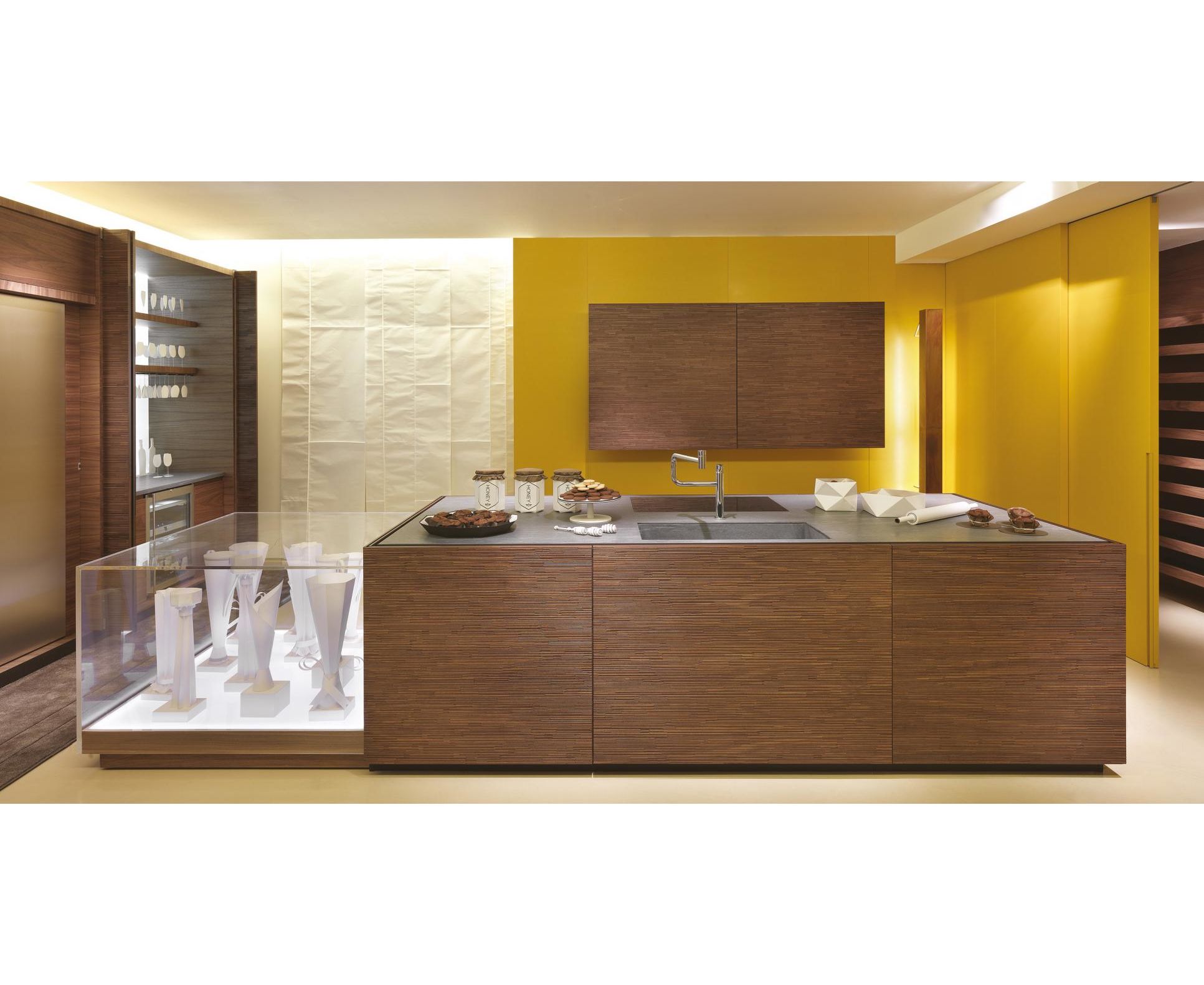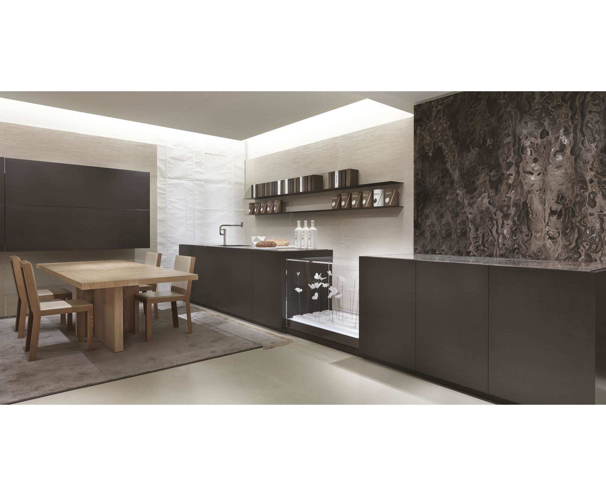 Bellagio Kitchen – это проект, осуществляемый на заказ, который позволяет находить и выполнять лучшие решения с точки зрения эстетики и функциональности. Раздвижные скрытые двери с насечками с обеих сторон прячут небольшую кухню, оснащенную раковиной, отделением-погребком для хранения вина и полкой с держателем для рюмок, в то время как спинка изготовлена из плексигласа со встроенной системой подсветки.