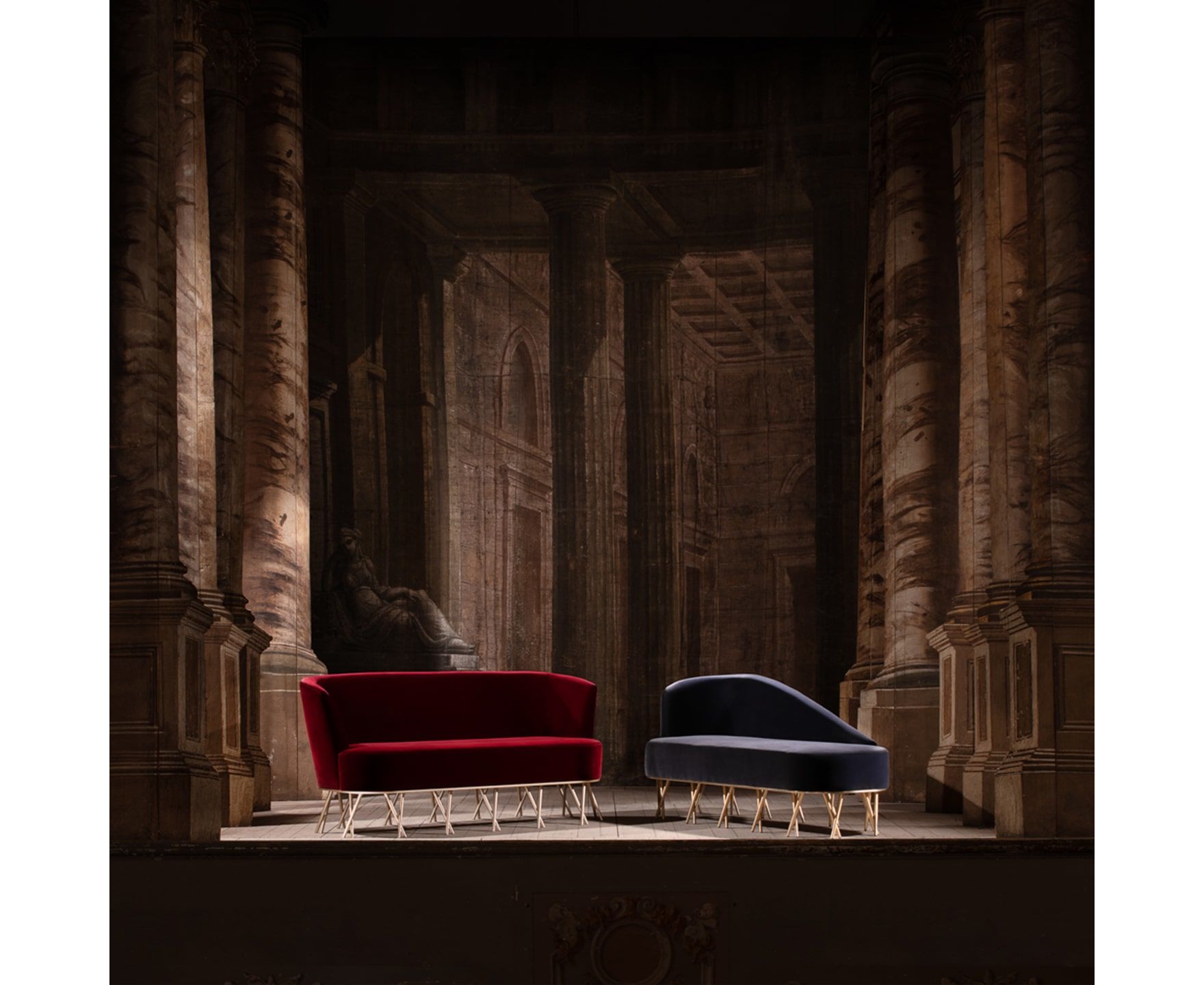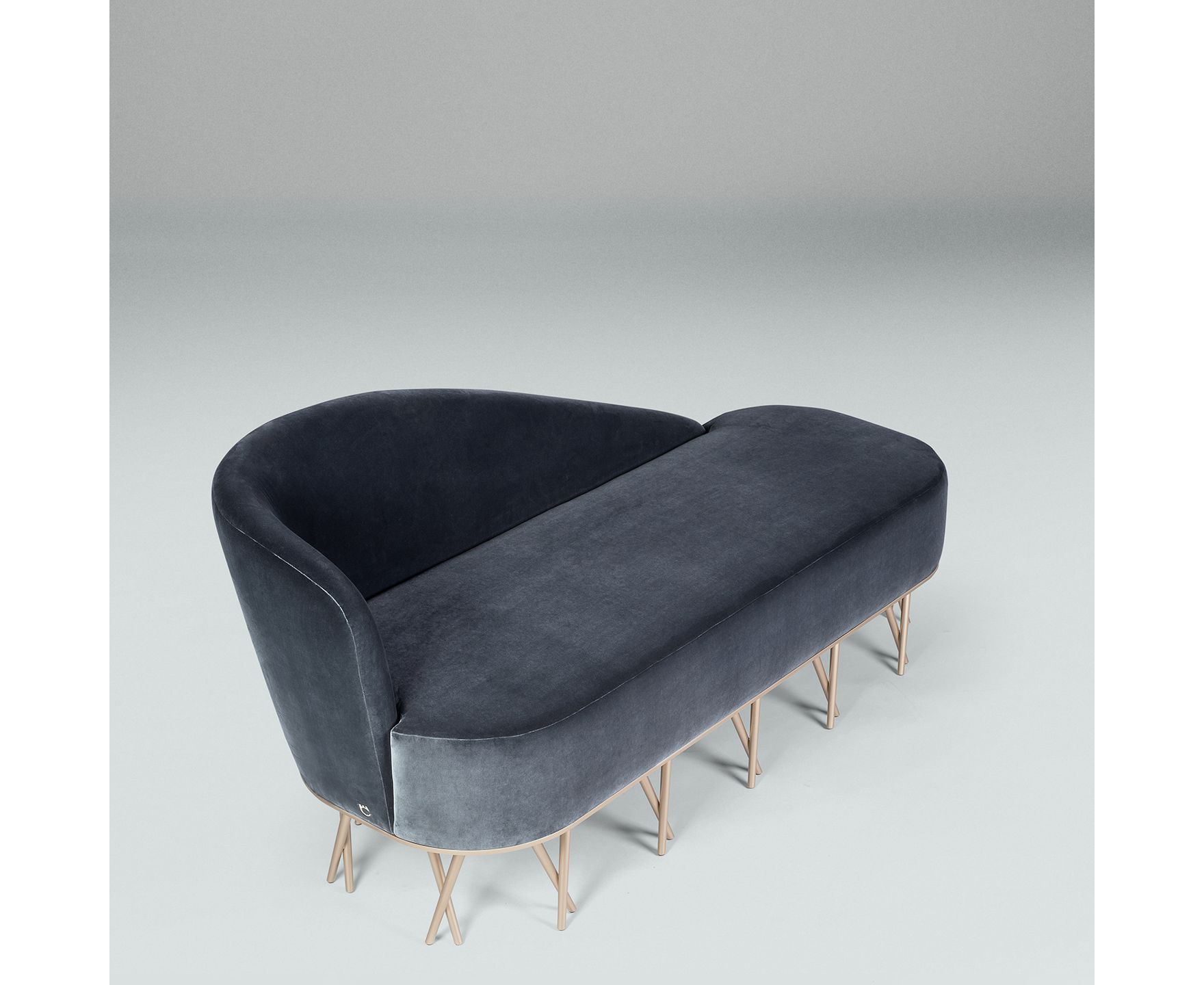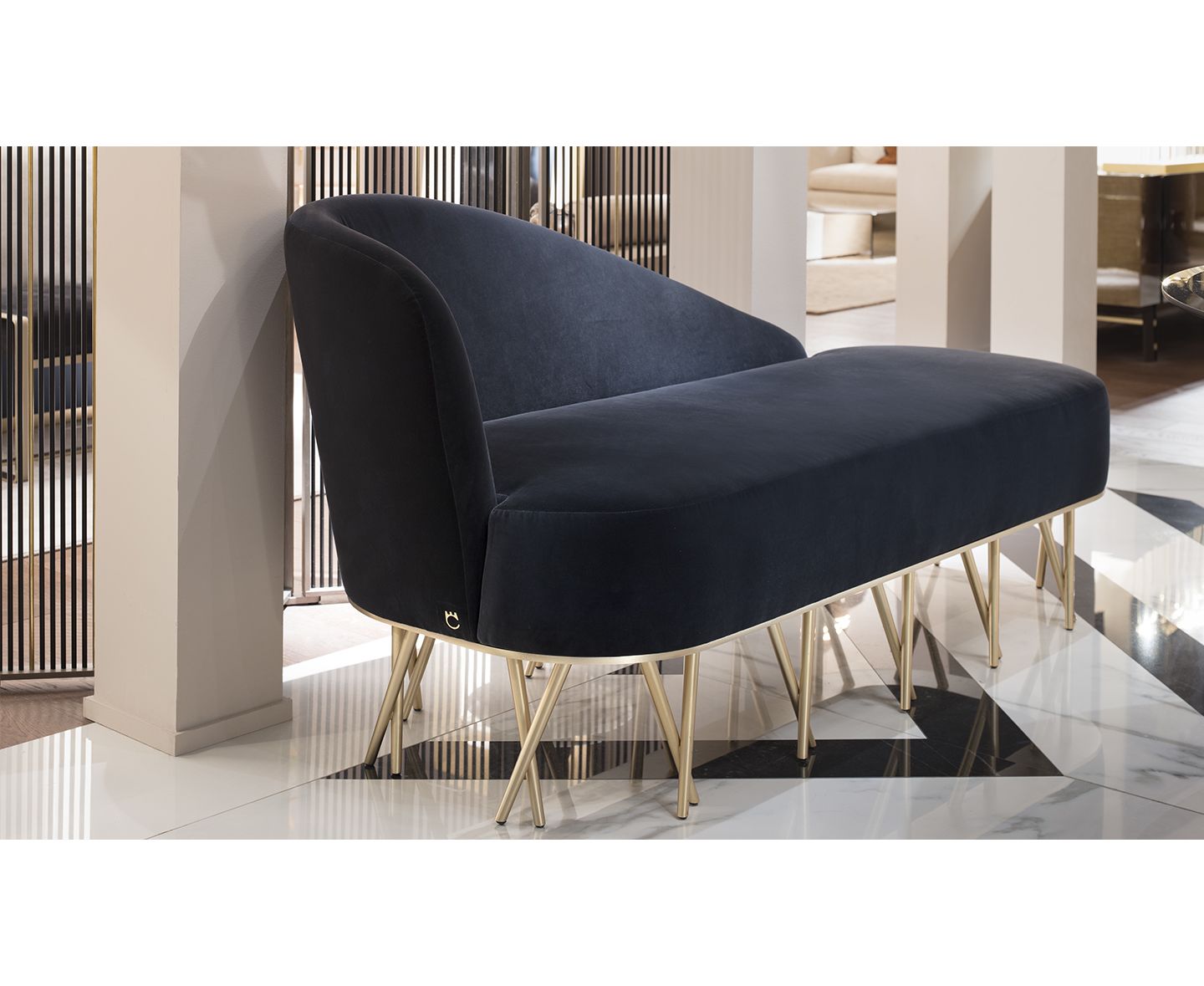 Orus dormeuse владеет очаровательными и привлекательными формами, напоминающими очарование эпохи красавиц. Идеально подходит для беседы или частного жилого пространства, состоит из изогнутой многослойной деревянной внутренней структуры, набивка изготовлена из пенополиуретана разной плотности. Несъемный чехол можно персонализировать с помощью изящных тканей, изысканной бычьей кожи и нубука. Dormeuse лежит на цельнометаллической конструкции с перекрещенными ножками, обогащенными гальваническим покрытием из драгоценного матового золота.