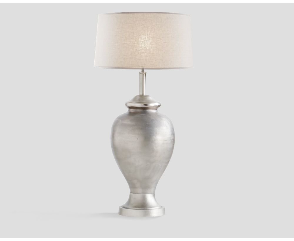 Lampada da tavolo, in fusione di alluminio, finitura sabbiata e lucidata con paralume tondo in tessuto Bianco