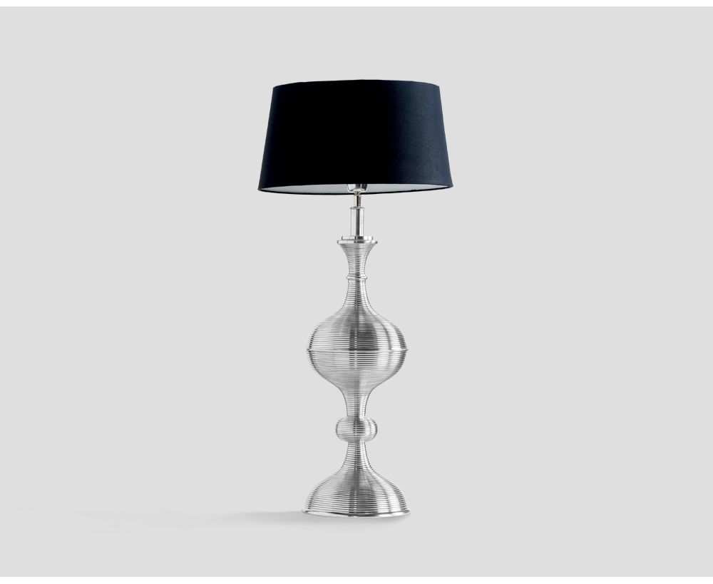 Lampada da tavolo, in fusione di alluminio, finitura nichel lucido con paralume tondo in tessuto Nero