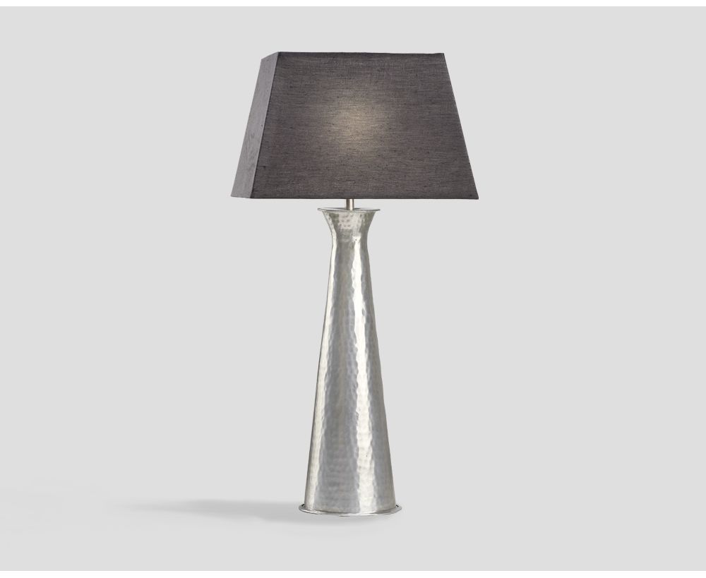 Lampada da tavolo in alluminio battuto finitura nichel lucido con paralume tondo in tessuto Nero