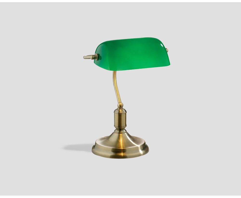 Lampada da tavolo in metallo, finitura ottone, con paralume in vetro verde brillante.