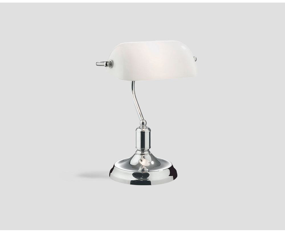 Lampada da tavolo, in fusione di alluminio finitura nichel lucido con paralume in vetro bianco.