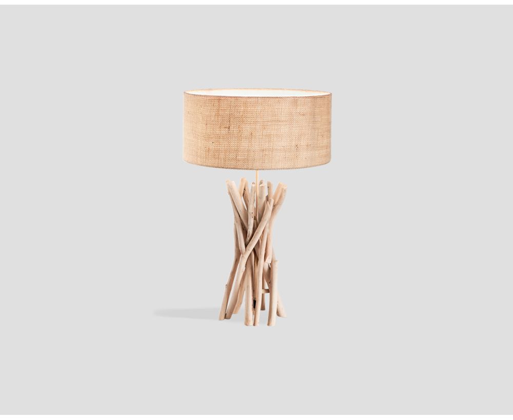 Lampada da tavolo in legno, finitura naturale, paralume in tessuto beige