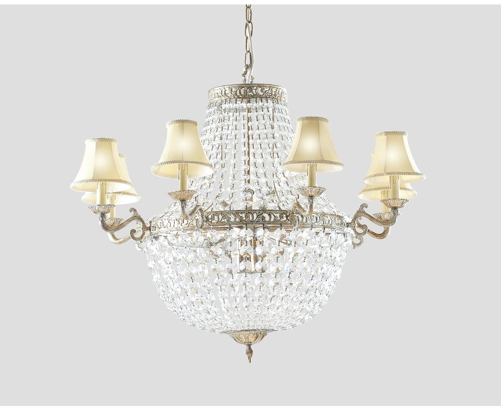 Lampadario in metallo finitura bronzata con 16 punti luce a doppia accensione, cascata di cristalli e paralumi in tessuto color Beige