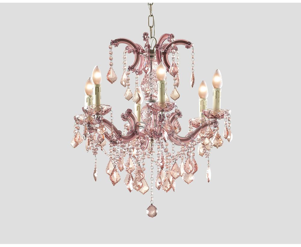 Lampadario in metallo con 6 punti luce, cristalli e pendenti color Rosa Antico