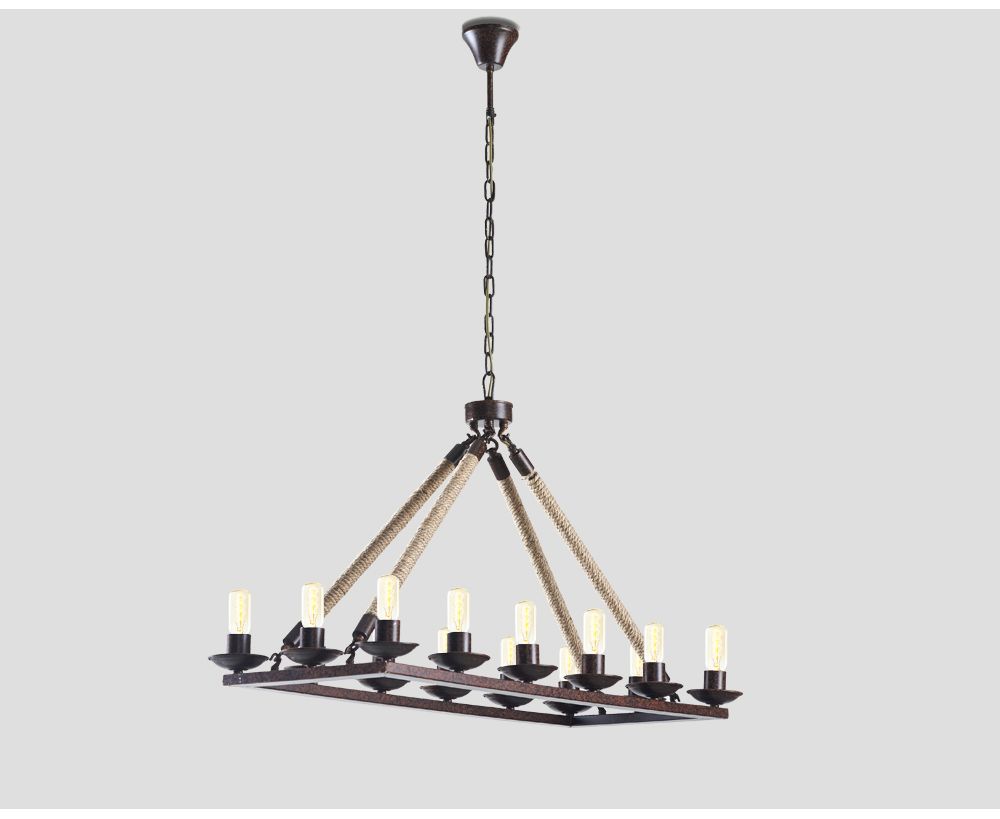 Lampadario 14 punti luce, in metallo finitura Arrugginita e rifiniture in corda