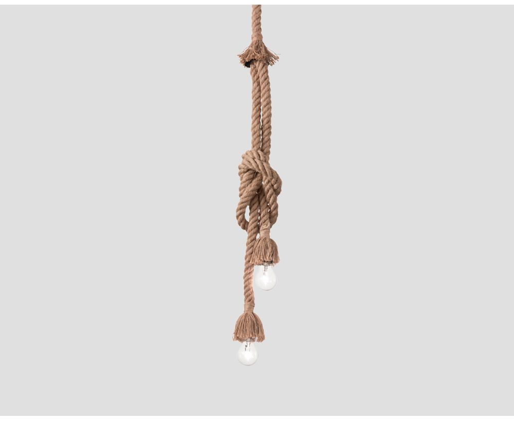 Lampada a sospensione, in legno e corda di canapa, finitura naturale.