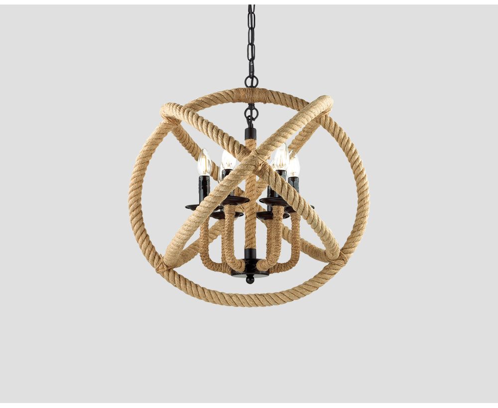 Lampadario 6 punti luce, in metallo, legno e corda di canapa, finitura naturale.