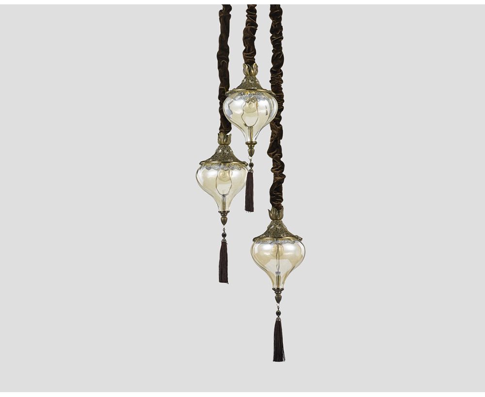 Lampadario 3 luci in metallo brunito, finiture in vetro soffiato con cristalli e pendenti