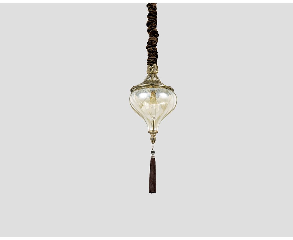 Lampadario in metallo brunito, finiture in vetro soffiato con cristalli e pendenti.
