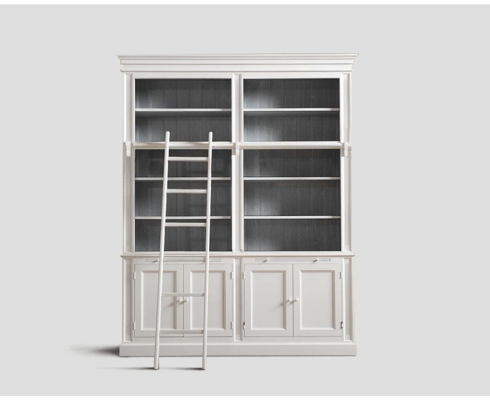 Libreria 4 porte + 2 tiretti, in legno con scaletta, laccato Bianco Vissuto con interni laccati e cerati a pennello color Grigio