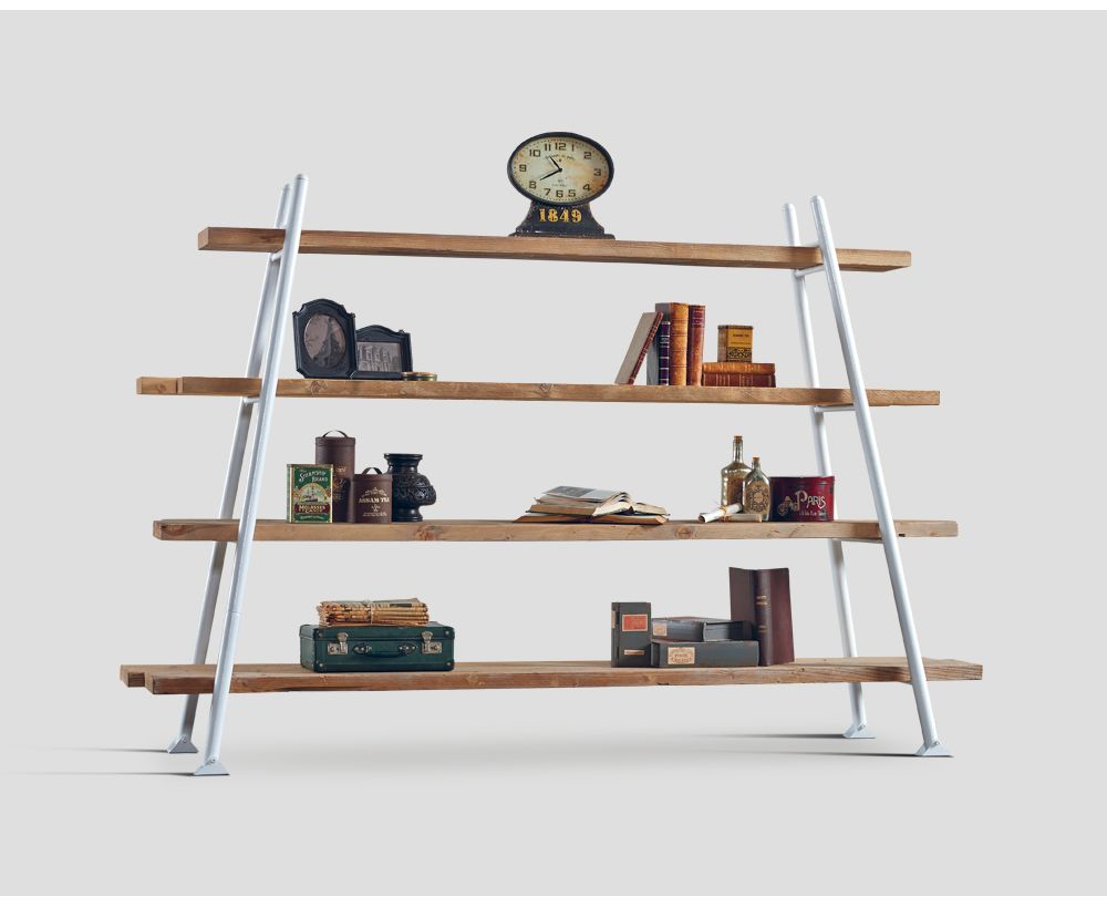 Libreria bifacciale con struttura in metallo finitura laccato Bianco, piani in legno vecchio riciclato finitura Naturale