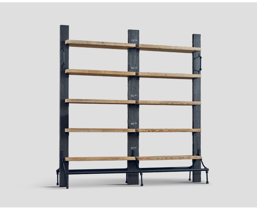 Libreria bifacciale in legno vecchio riciclato, struttura laccata e cerata a pennello color Lavagna, piani finitura Naturale, accessori in metallo finitura Ferro Brunito