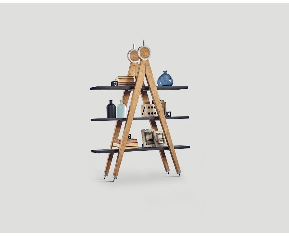 Etagère bifacciale in legno vecchio riciclato con struttura finitura Naturale, piani laccati e cerati a pennello color Lavagna, inserti in acciaio inox spazzolato