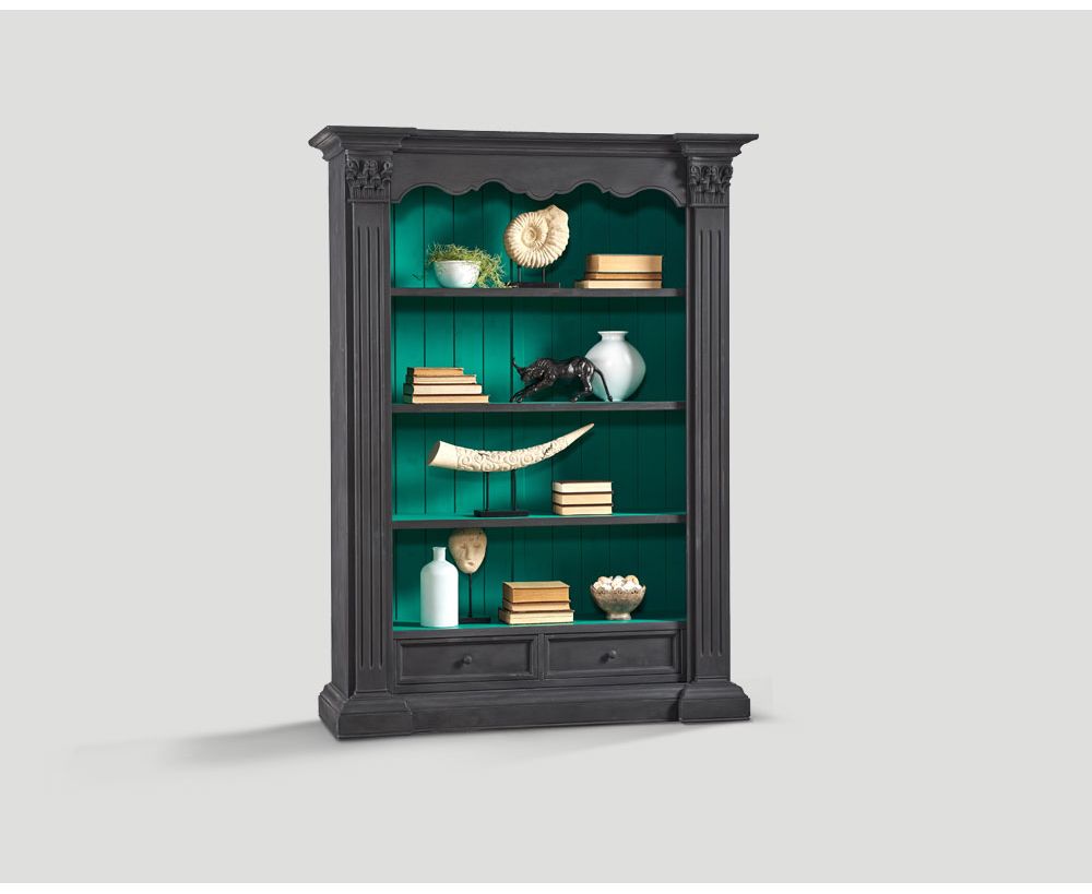 Libreria 2 cassetti, in legno laccato e cerato a pennello color Lavagna, interni finitura Verde Smeraldo